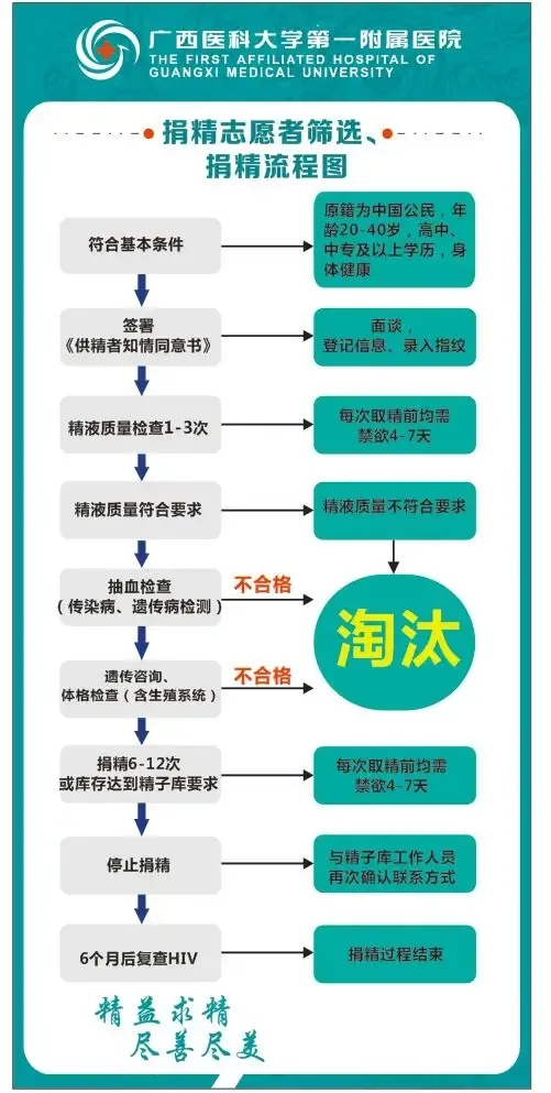 广西人类精子库。广西人类精子库供图 预约方式 捐精志愿者可在“广西人类精子库”微信公众号上回复:名字+联系方式+学历+预约日期,医院将会在24小时内回复。 捐精流程 1、初筛期: 预约后,按照注意事项准备好,按预约日期到精子库参加免费体检。 (取精成功即发放50元每次,约筛查2次)。 2、合格期: 筛查合格后,每3-7天不排精,在接待时间内到精子库捐献。 (标本合格奖励200元每次,标本不合格奖励50元每次,约6-12次)。 3、半年复查: 合格期在三个月内按时按量(约20毫升)完成后开始计时,满6个月后回精子库体检。 (按时完成者体检合格后奖励1500元,如超时完成只奖励1000元)。 注:每次花费时间短,但整个流程需要往返多次,外地志愿者谨慎报名。