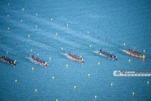 10月2日,柳州市融安县在融江长安水域举办龙舟大赛,庆祝国庆中秋佳节。200多支龙舟劲旅、4000余名运动员激情角逐,吸引近万名游客聚集两岸观赛助威。图为比赛现场。何华文 摄(广西云-广西日报)