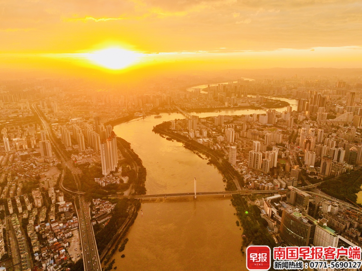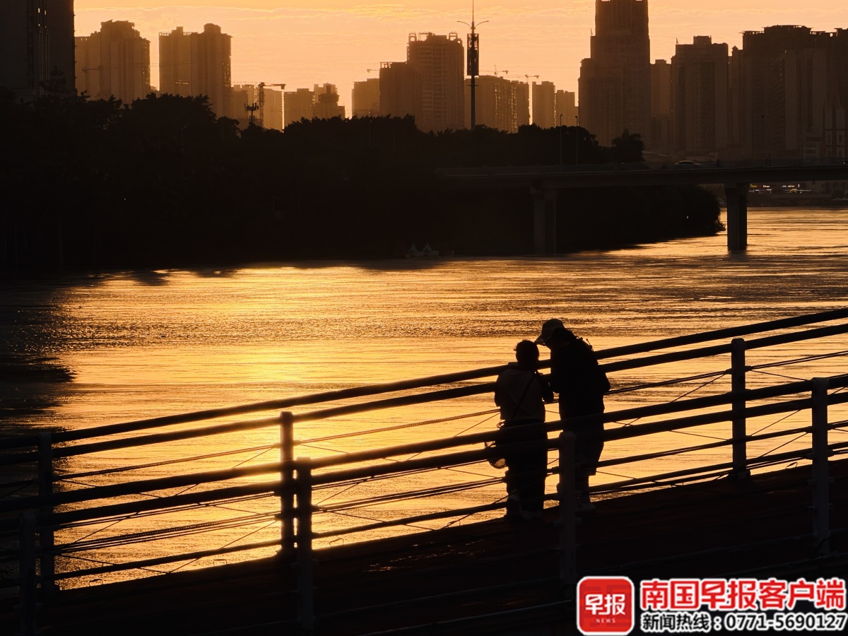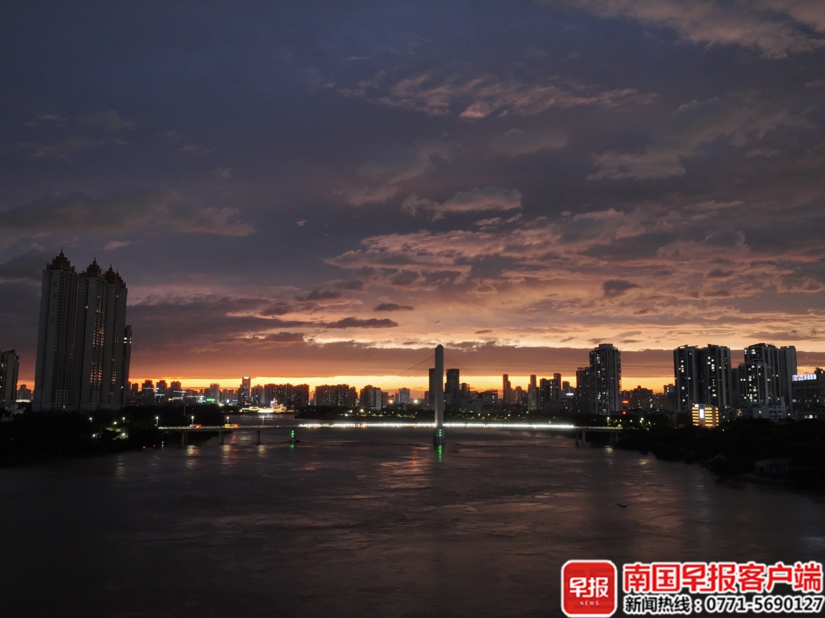 10月5日傍晚,台风“麦德姆”来临前,南宁市出现壮观的火烧云,半边天空变得一片金黄,夕阳余晖染红了邕江。 南宁市葫芦鼎大桥一带,有市民在江边停下脚步,记录这壮美一刻。 美图来啦 ↓↓↓ 晚霞晕染了整片天空,邕江变得一片金黄。 金黄的江水从白沙大桥下流过。 金黄的邕江水从亭子码头旁流过。 城市的建筑沉浸在一片金光中。 晚6时许,南宁市西边的天空变得金黄一片。 南宁市东边的天空出现巨大的彩虹。 市民在邕江边看火烧云。 晚6时50分,夕阳余晖在地平线逐渐消失。 |
