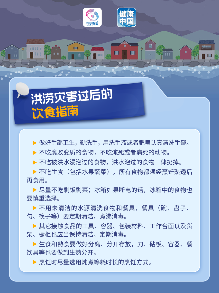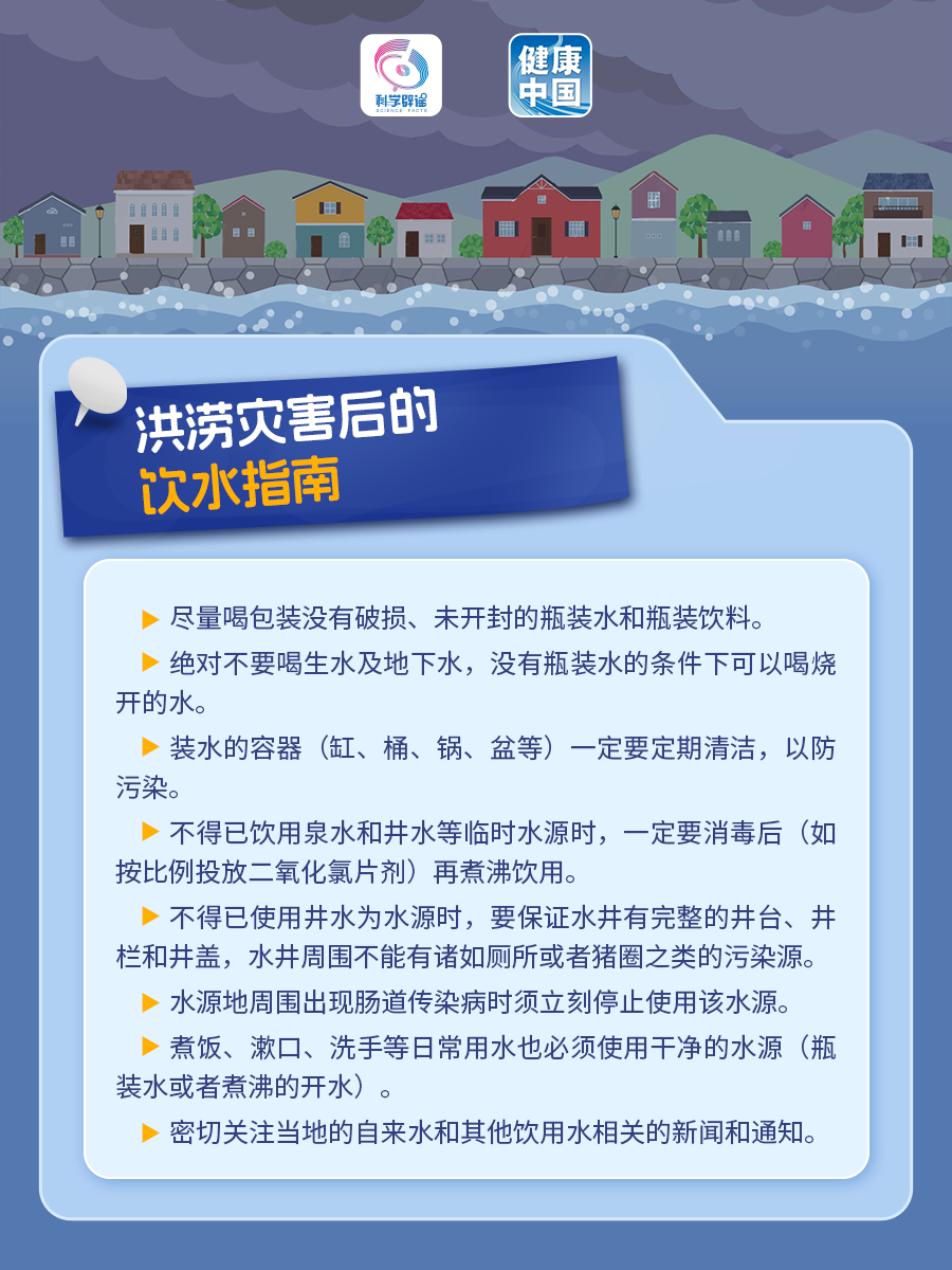 暴雨洪涝之后 是传染病等各种疾病的高发期 如何做好消毒与防护 这份健康提示请收好~ 注意饮用水安全 将水煮沸是十分有效的消毒防病方法,因此在暴雨、山洪过后要提倡喝开水,不喝生水。 自来水如果有氯味,属于消毒后的正常现象,加热即可去除氯味,可以放心饮用。 恢复自来水供给后,居民水龙头放水10~15分钟,直至清澈无色、无臭、无味后,才能使用。如自来水出现色、臭、味异常,浑浊等,居民应停止使用,并报告相关部门进行调查,待水质达标后方可饮用。 使用山溪水、水井水等的居民,应该对水进行消毒后使用。山溪水、水井水应在疾控机构指导下澄清、消毒后再使用。 如日常生活饮用水受到污染,则可优先使用瓶装水、桶装水,其次是经消毒处理后的临时性应急用水。购买瓶装水、桶装水时,应选择有食品生产许可证且在有效期内的产品。 环境消杀和清洁要做好 一、灾区不是疫区,要有针对性地及时开展清洁卫生与预防性消毒工作: 灾害后,返回家园之前确认房屋处于安全状态;对遭受灾害的室内外环境进行彻底的清理消毒,做到先清理、后消毒、再回迁,特别加强对厕所、垃圾桶、下水道等容易滋生细菌地方的消毒; 居家、街道、社区、安置点等场所物体表面、墙壁、地面可采用500mg/L含氯消毒剂,或200mg/L二氧化氯,或1000mg/L过氧乙酸喷洒消毒10分钟或擦拭消毒5分钟。 餐(饮)具清洗后首选煮沸消毒,煮沸时间应在15分钟以上。也可使用消毒剂进行浸泡消毒,如用250mg/L~500mg/L含氯消毒剂浸泡10分钟,消毒剂浸泡后应以清洁水冲洗干净。 特别注意: • 84消毒液不能和其他清洁剂混合使用; • 家用洁厕灵不可以和含氯消毒剂混用; • 家用漂白剂不能和氨水、酒精等混用。 二、做好防制苍蝇、蚊子和老鼠的工作: 及时清理垃圾,做到垃圾不落地、不过夜,防止苍蝇接触产卵; 及时清除生活区周围的小型积水(含容器积水),个人喷涂驱避剂,家庭安装纱门、纱窗等防蚊设备; 放置鼠夹、投放鼠药等方法扑杀老鼠。 做好个人健康防护 1. 坚持勤洗手,尤其是在用餐前后、处理食物前后、哺乳前后、处理伤口前后,洪涝期间接触垃圾、洪水或动物尸体后,要使用肥皂或洗手液彻底清洁双手,尽量避免用手触摸口鼻。 2. 要密切关注自己和家人的身体状况,饮食起居要规律,避免过度劳累,随时注意天气变化,适时增减衣服。一旦出现如发热、呕吐、腹泻、皮疹等症状,要尽快就医。 更多灾后饮水、饮食、生活指南 请查收 ▼▼▼ |