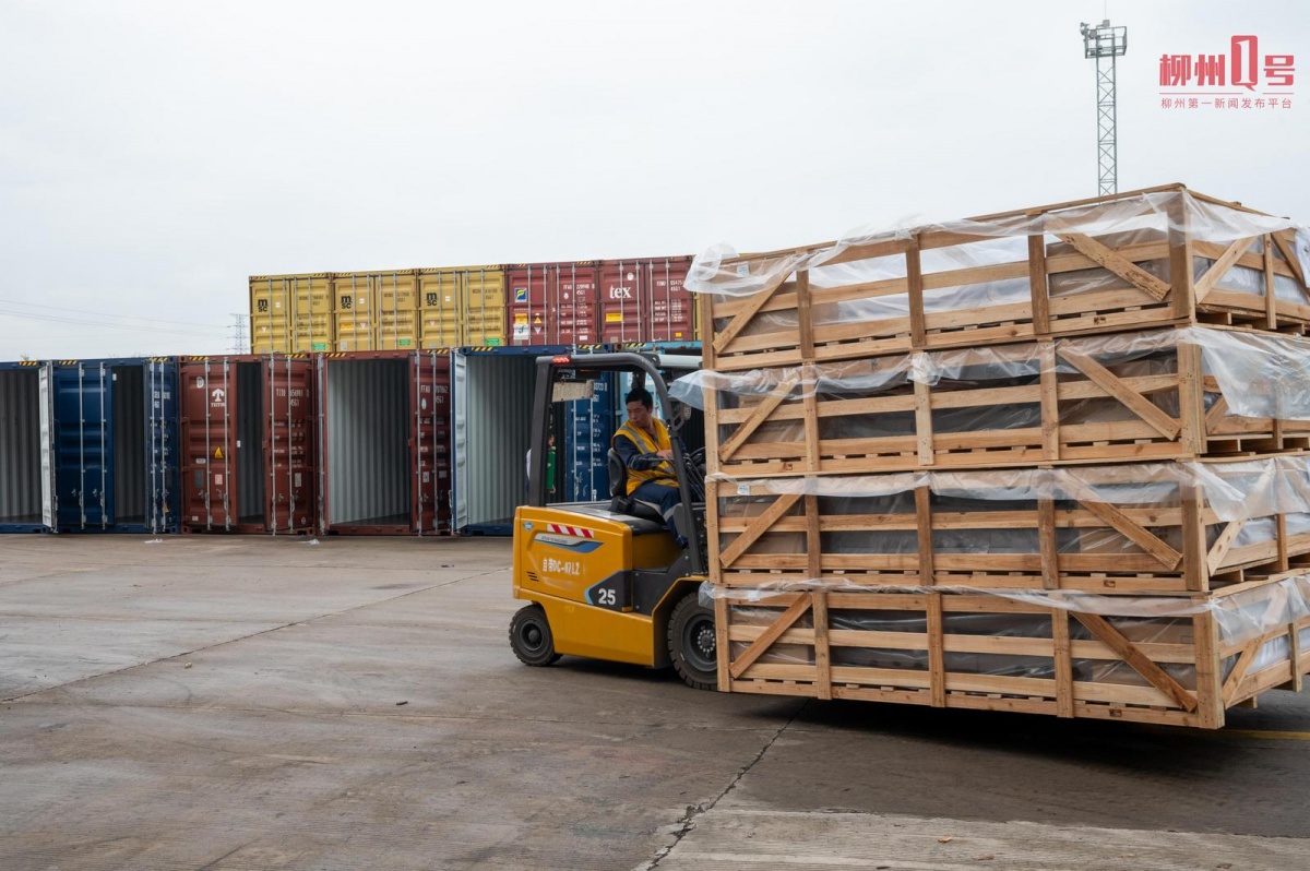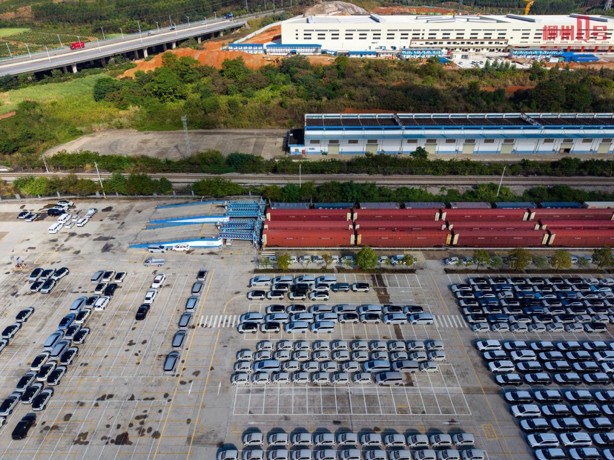 11月8日,在柳州雒容汽车物流基地内,一批新能源汽车零部件正有序装车,即将通过铁海联运班列发往印尼、埃及、印度等全球市场。