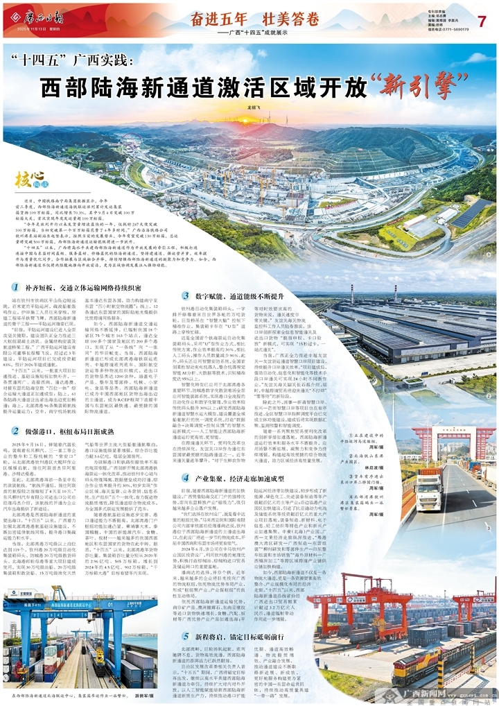 正在建设中的平陆运河马道枢纽。周军 摄 “目前,平陆运河建设已进入全面攻坚关键期,建设团队正全力推进三大枢纽混凝土浇筑、金属结构安装及航道桥梁工程。”广西平陆运河建设有限公司董事长程耀飞说,经过近3年建设,平陆运河项目已完成投资超83%,预计2026年建成通航。 “十四五”以来,一批重大项目加速推进、基础设施短板加快补齐,一条贯通两广、连接西南、通达港澳、对接东盟的陆海空数“四位一体”综合运输大通道正加速成型:陆上,61条陆路大通道让出省出海出边更加畅通;海上,北部湾港96条集装箱航线提升运量运力;空中,南宁机场航线基本通达东盟各国,助力构建南宁至东盟“四小时航空物流圈”;线上,12条通达东盟国家的国际陆地光缆提供优质跨境网络服务。 如今,西部陆海新通道交通运输网络不断延伸,已辐射我国18个省区75个城市163个站点,通达全球100多个国家及地区的200多个港口,实现了从“一条线”向“一张网”的华丽蜕变。当前,西部陆海新通道已形成北部湾港海铁联运班列、中越跨境班列班车、国际航空货运等多种物流组织模式,进出口的货物品类达1200余种,涵盖电子产品、整车及零部件、机械、小家电、食品等品类。西部陆海新通道已成为中国西部地区货物出海出边的主通道,成为RCEP框架下连接中国与东盟地区最快速、最便捷的国际物流通道。 做强港口,枢纽布局日渐成熟 2025年9月16日,伴随着汽笛长鸣,装载着东风柳汽、三一重工等企业的整车和工程机械的“常安口”轮,从北部湾港钦州港区大榄坪作业区缓缓启航,前往阿联酋杰贝阿里港、沙特达曼港。