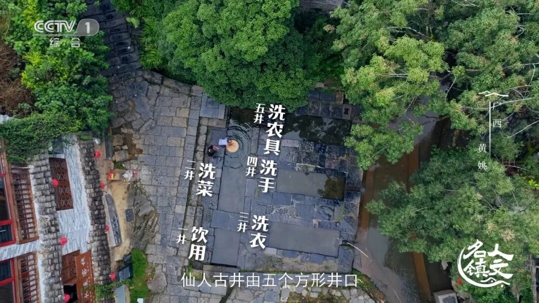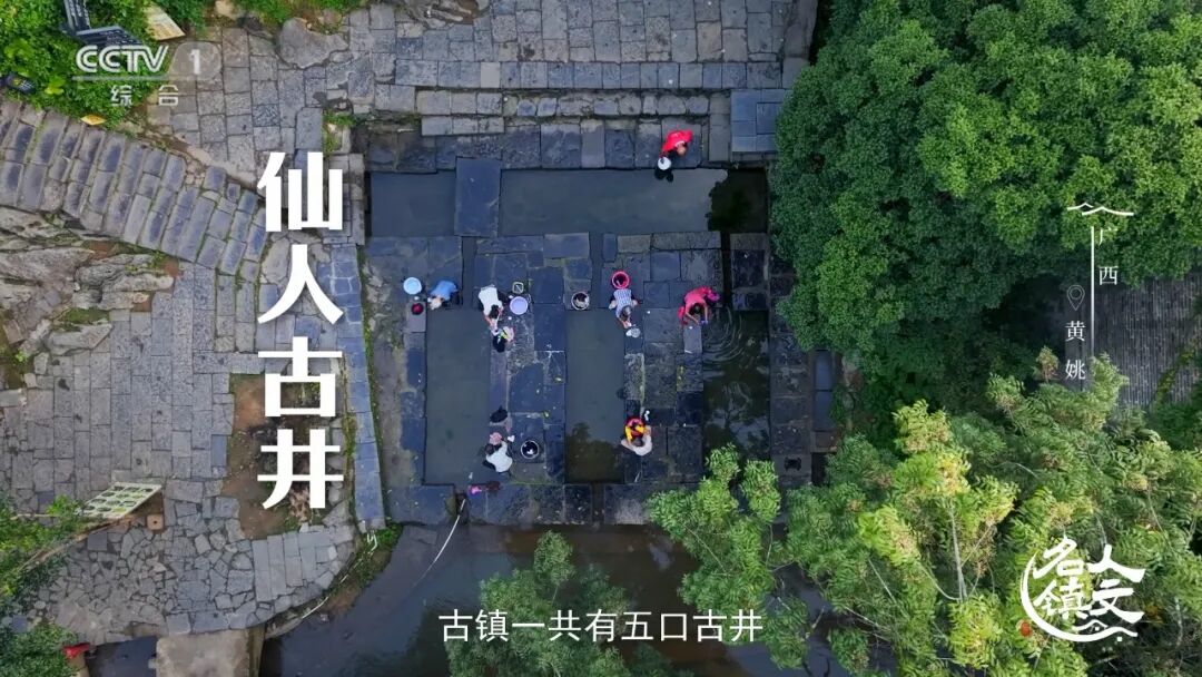 黄姚地区处于亚热带区域,降雨量丰富,但岩溶地貌使地表水流失严重。迅速增多的人口,让原本不多的水如何分配成了黄姚人必须共同面对的生存课题。 古镇共有五口古井,其中,仙人古井最大,也最为出名。与寻常圆形井口不同,仙人古井由五个方形井口依次串联而成,引兴宁河活水为源。从仙人古井建成的400年前开始,在黄姚古镇生活的人,就共同遵守着用水的规则。头井是最为洁净的饮用水,所有入井的木桶必须提前洗净。