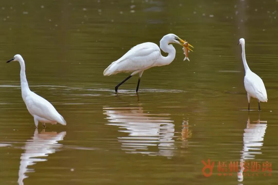 梧州玫瑰湖公园里,大白鹭和小白鹭在湖里觅食。何鎏 摄