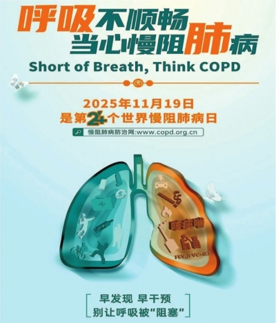 每年11月第三周的周三是“世界慢阻肺日”,2025年11月19日是第24个世界慢阻肺日。今年的主题是“呼吸不顺畅,当心慢阻肺。”该主题旨在提高公众对慢性阻塞性肺疾病的认知,强调早期诊断与肺功能检查的重要性。