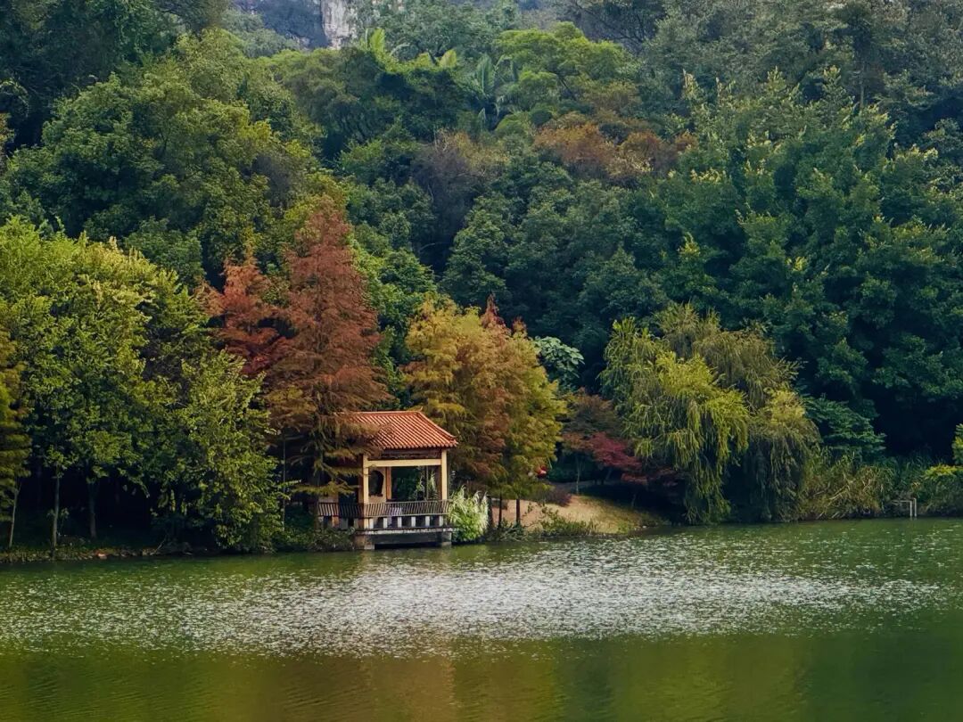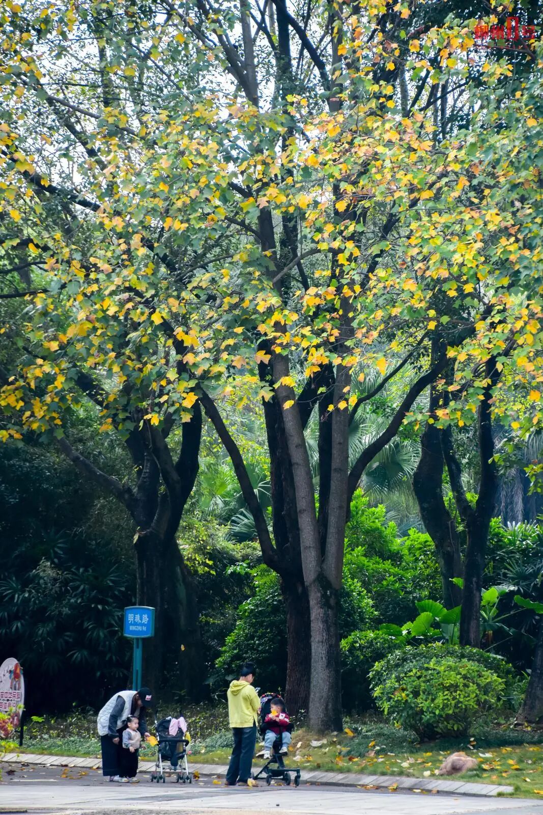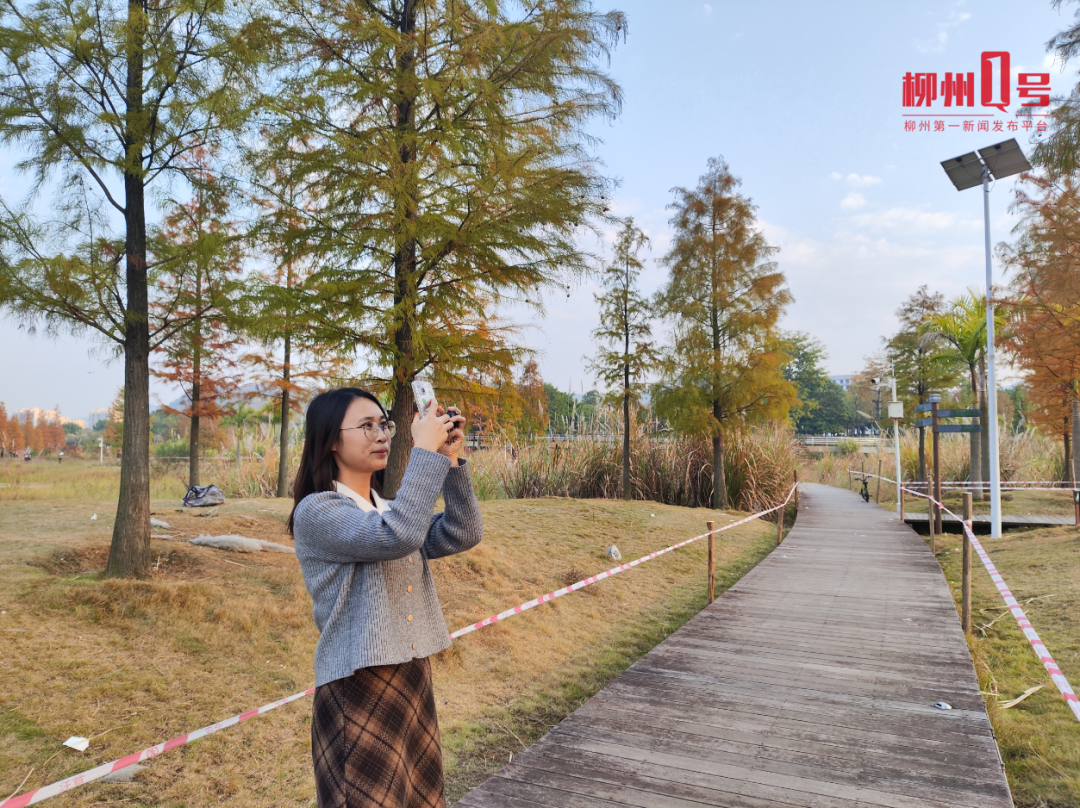 市民在鹅掌楸下拾起落叶。 柳州园博园渐变色树木共谱“秋去冬来”的变奏曲,最佳观赏期为十二月中旬,快去赏玩吧! 龙潭公园 初冬时节,龙潭公园迎来一年一度的色彩盛宴。湖畔的水杉与池杉悄然换装,由青翠渐变为璀璨的金黄与深红。挺拔的树干倒映在如镜的湖面,羽毛状与针状的叶片在阳光下交织,宛如一幅浓烈而宁静的油画。