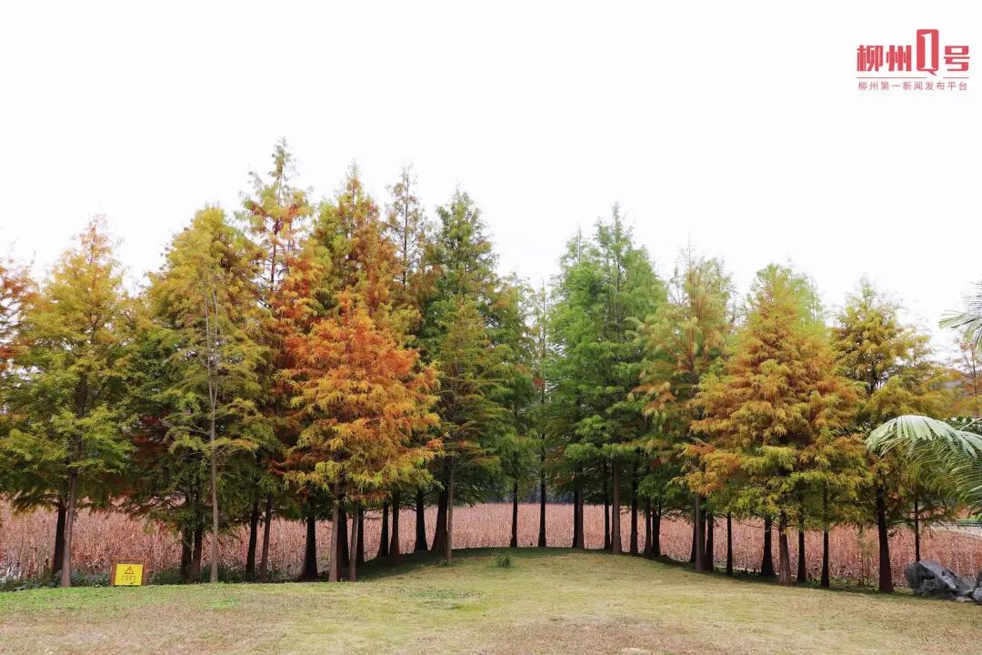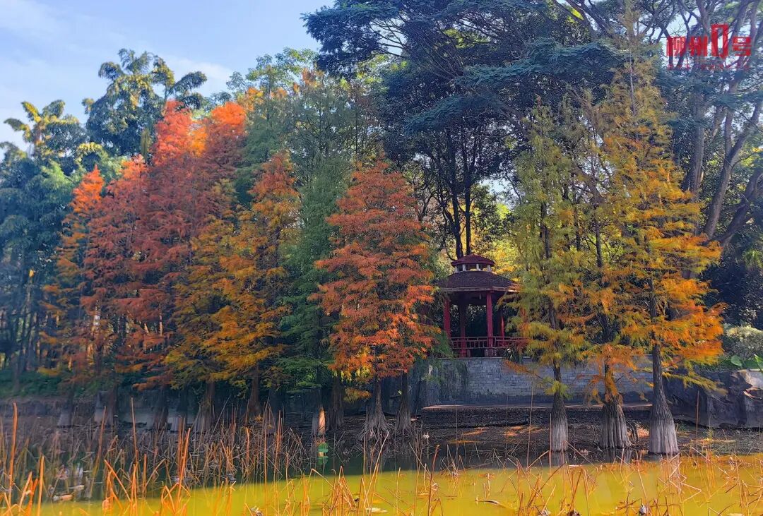 都乐公园柳湖畔。 不妨到都乐公园走走,去捕捉这场限时色彩盛宴中最打动你的那一帧。 柳州园博园 冬日的柳州园博园,360余株池杉、水杉与落羽杉正悄然开启“变装计划”——树冠从青绿过渡至金黄,梢头初晕焦糖色,如打翻的油画颜料层层浸染,编织出一袭渐变色“冬装”。