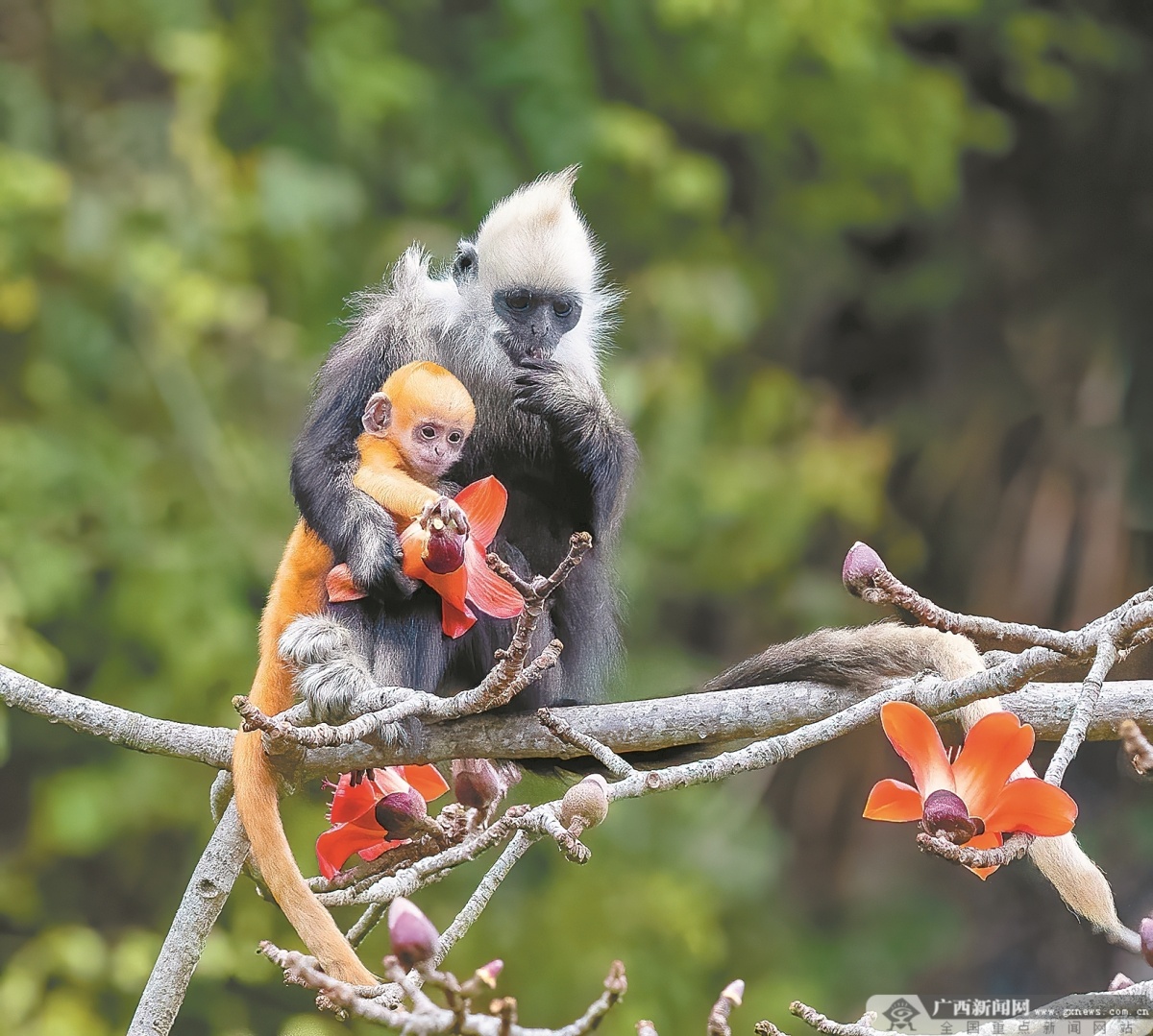 在崇左白头叶猴国家级自然保护区,白头叶猴母子在采食花蜜。吴兆荣 摄 来源:广西云-广西日报
