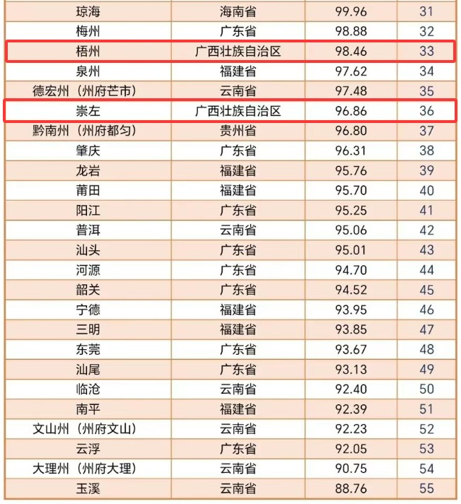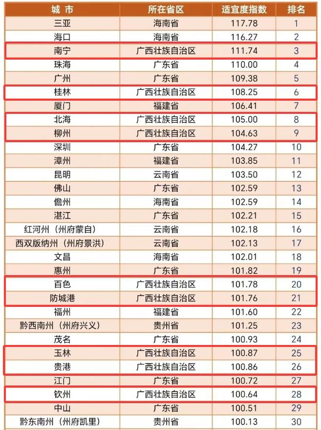 近日,由上海交通大学研究院研发的《2025中国候鸟式养老冬季栖息地适宜度指数》发布。 广西表现亮眼 11个市上榜! 南宁、桂林、北海、柳州进入TOP10 百色、防城港、玉林、贵港、 钦州、梧州、崇左进入前50名 2025中国候鸟式养老冬季栖息地 适宜度指数排行榜 ↓↓↓
