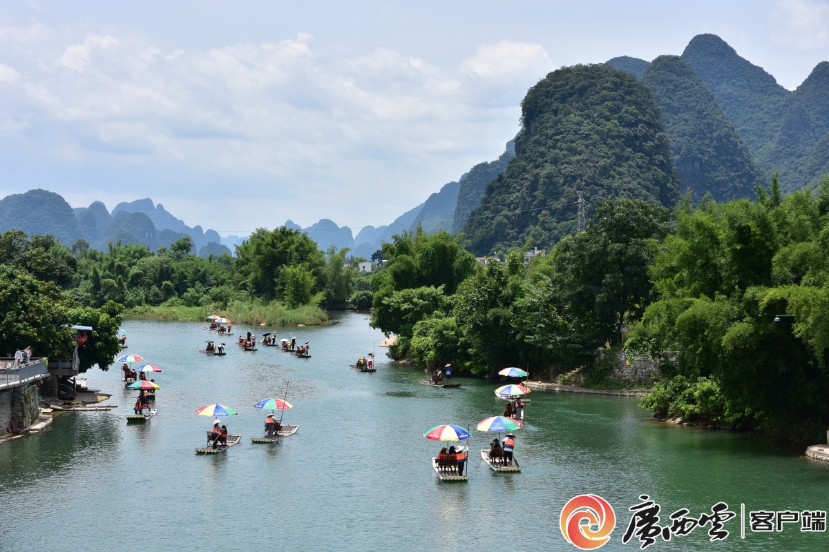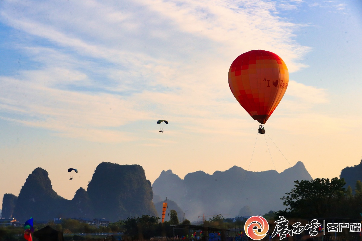 游客在阳朔县体验热气球、滑翔伞。李忠波 摄 来源:广西云-广西日报 游客在桂林遇龙河乘坐竹筏漂流观景。廖祖平 摄 来源:广西云-广西日报