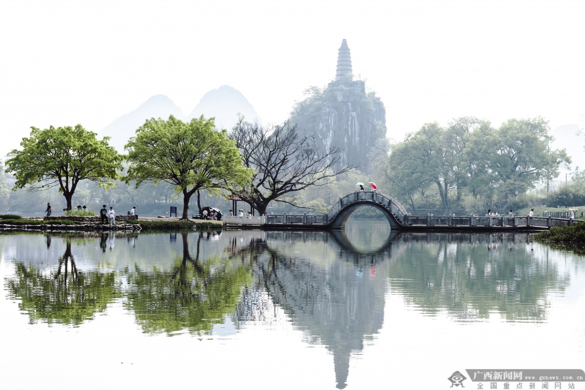 在桂林塔山公园,水面和塔山形成镜面,极富诗意。黄智权 摄 来源:广西云-广西日报