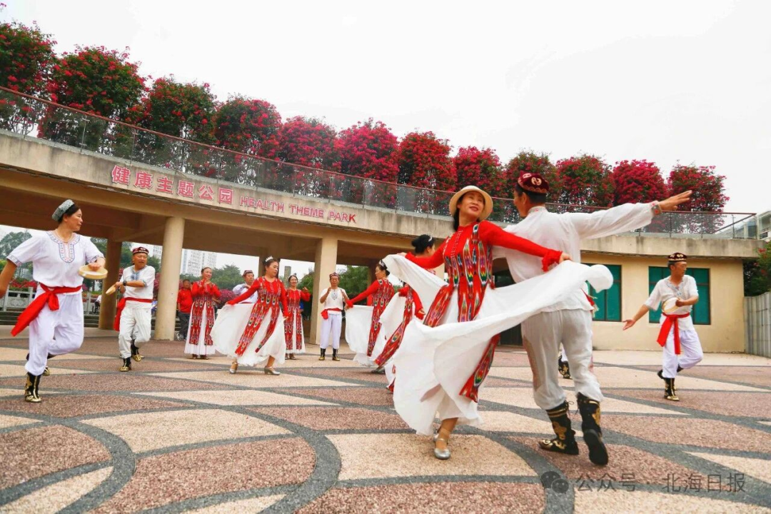 旅居者在市花公园里跳起灵动的新疆舞。吴礼娜 摄 来源:北海市融媒体中心