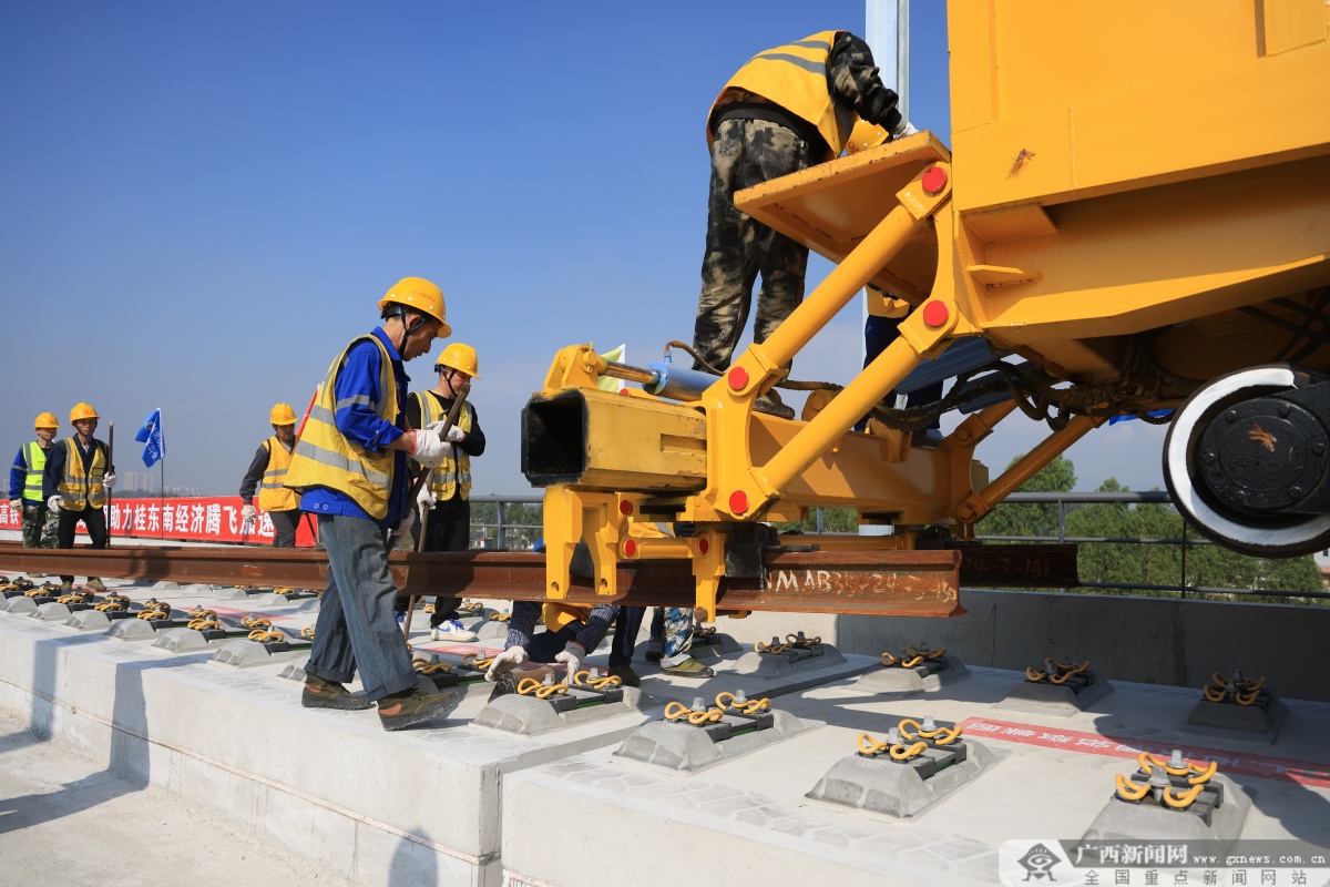 12月20日,在广西北流市境内的南珠高铁玉林北至岑溪东段铺轨施工现场,随着铺轨机将首对500米长钢轨平稳铺设在无砟道床板上,南珠高铁玉林北至岑溪东段进入全线铺轨阶段。