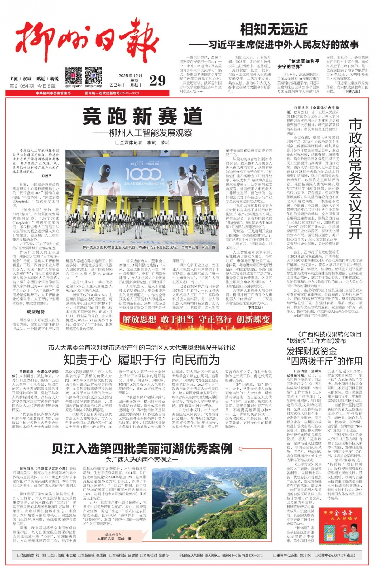 《柳州日报》2025年12月29日版面截图。 “要推动人工智能科技创新与产业创新深度融合,构建企业主导的产学研用协同创新体系,助力传统产业改造升级,开辟战略性新兴产业和未来产业发展新赛道。” 日前,由国家语言资源监测与研究中心等权威机构主办的“汉语盘点2025”活动在京揭晓“年度字词”,“深度求索(DeepSeek)”当选年度国内词。 “年度字词”犹如一枚“时代芯片”,存储着国家发展的铿锵足迹。“深度求索(DeepSeek)”当选年度国内词,不仅标志着人工智能正从专业领域的概念逐步融入大众日常生活,更反映出人工智能蓬勃发展的态势。 人工智能,开启了面向未来的产业发展和城市竞争新赛道。