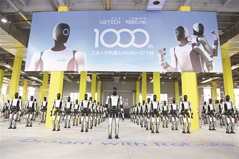 柳州优必选第1000台工业人形机器人Walker S2下线仪式现场。黄蕊 摄 作为广西最大的工业城市,柳州深入实施“人工智能+制造”行动,竞跑人工智能新赛道:下线广西首台工业人形机器人,实现“柳产人形机器人造柳产车”;首批功能型低速无人驾驶车辆驶入公开道路;会“讲”东盟国家语言的新能源汽车扬帆出海……在柳州这片工业沃土,“人工智能+”应用场景遍地开花,人工智能企业纷至沓来,人工智能产业聚木成林,焕发勃勃生机。 成型起势 两百余台人形机器人组成恢宏方阵,宛如即将出征的铠甲战队。一台刚走下生产线的机器人穿越方阵小跑而来,挥着手说:“我是优必选柳州机器人超级智慧工厂生产的第1000台工业人形机器人Walker S2……” 这是12月26日,柳州优必选第1000台工业人形机器人Walker S2下线的场景。 当天下线的Walker S2,主要面向智能制造场景使用,可以实现单机自主和群体协同作业,并借助首创的自主换电技术实现不间断运行。距离6月18日广西制造的首台工业人形机器人Walker S1在该公司下线,仅仅过了半年时间,其发展速度令业内惊叹。 优必选创始人、董事会主席兼CEO周剑激动地说:“未来,优必选的机器人不仅‘柳州造柳州用’,更要‘广西造全球用’,为人形机器人产业发展贡献更多柳州智慧、广西力量。” 人形机器人,是人工智能技术的集成体现,更是未来产业的重要赛道之一。作为全球顶尖的人工智能和人形机器人研发制造企业,深圳市优必选科技股份有限公司缘何奔赴柳州设厂?