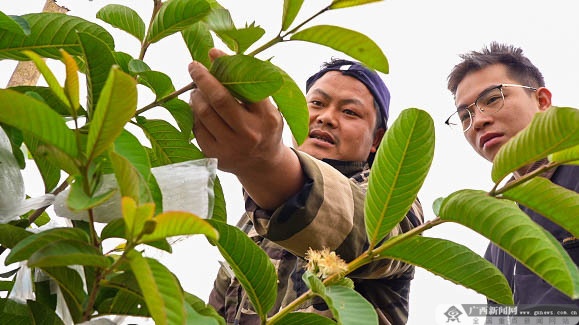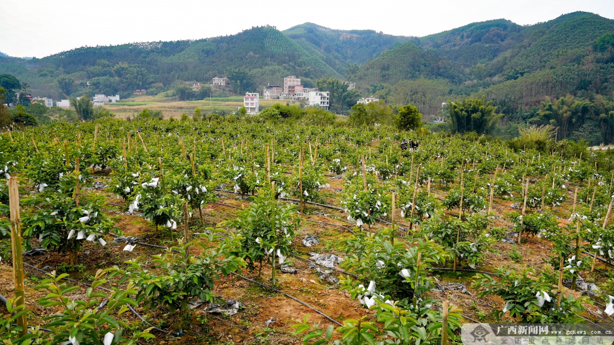 那田岩腾芭乐园农场负责人现场介绍西瓜红芭乐果树。 冬至已至,寒意渐浓,河池市巴马瑶族自治县百林乡那田岩腾芭乐园农场内却暖意融融,果香四溢。40亩连片的芭乐果园郁郁葱葱,翠绿的枝叶间挂满套着白色保护袋的果实,即将迎来丰收。 轻轻揭开果袋,馥郁的果香扑面而来。果实圆润饱满、色泽光亮,令人喜爱。农场负责人郑康华介绍:“这片芭乐是今年3月种下的,现在已经全部挂果。它属于四季果,一年可以多次采收。预计从2026年1月底开始,能一直采收到5月左右,分批上市。” 该品种芭乐不仅香甜可口、耐储运,而且管理相对简便、挂果周期长、见效快,具有良好的种植效益。郑康华一共种了3800株果苗。他选择这个品种,主要是看中它市场需求大、价格稳定,还能实现当年种植当年收益,资金回笼快。“这种水果营养丰富,个大皮脆、肉糯味甜,很受欢迎。”