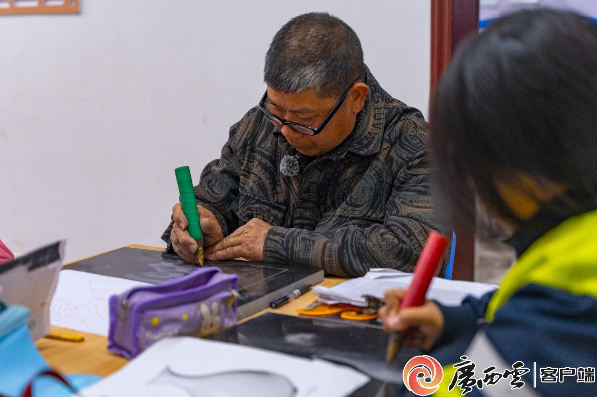 左世运正在教授孩子们凿刻作品。记者 庾琳 摄 从此,他埋首石粉与时光。领袖像的发丝、国徽上的麦穗、风景深处的层峦……每一处都需要数万次的精准叩击,“最难的是红色印章,纤毫间的篆字筋骨,浑厚中见精微,每一凿我都小心翼翼,紧张得几乎不敢呼吸。” 2018年,最后一凿落定,18年光阴凝于93块石板时,他的成就感难以言表——那是一名匠人对自己国家最虔诚的致敬。如今,他决定无偿将其捐赠给博物馆:“希望这份敬意能与更多人相遇、共鸣。” 午后4时,左世运赶往平桂区文华学校。每周二、四,他必到“非遗影雕”传承工作室授课。20余名孩子握凿在石板上敲出花朵、花瓶等简单纹样,“嗒、嗒”声稚嫩沉实却充满生机。“不指望每个孩子都成为大师,只要他们体验过让石头开花的乐趣,这门技艺的传承就多一分希望。”他坦言。 左世运在上影雕课。记者 陆奕江 摄 夜色渐深,三楼工作室里凿声再起,清冷孤寂,却稳如心跳。“我这一生很精彩,因为爱上了艺术。”从偶然结缘,到与石半生相守,再到传递星火,左世运以石为纸、以凿为笔,续写着古老技艺的新章。 万千星白,绽于墨石;岁月留痕,刻进光阴。最恒久的光芒,从不在某件作品完成的瞬间闪耀,而在匠人们俯身为石的每个晨昏里。他们以掌心温度,将这门绝活的微芒,一凿一凿“绣”进坚硬的石头,让贺州影雕跨越时光长河,把家国记忆、匠人坚守,代代相传。