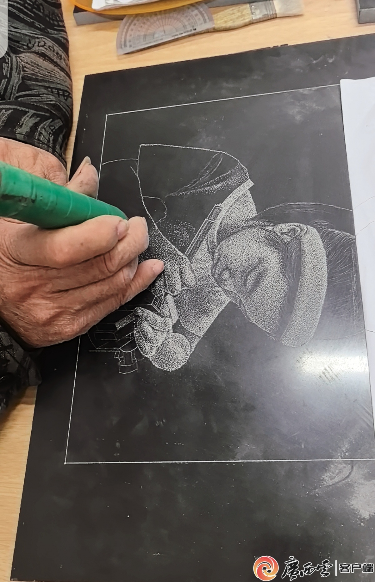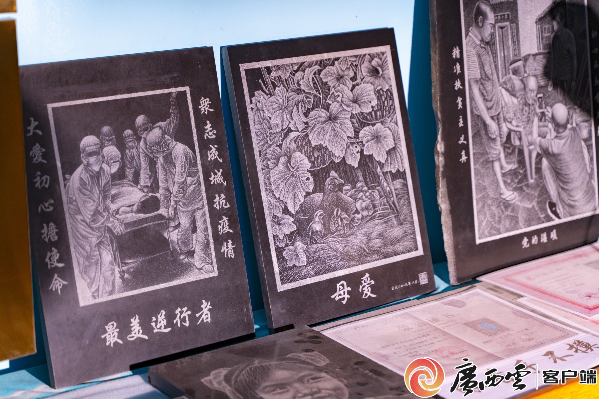 左世运正在制作影雕。记者 陆奕江 摄 影雕,源于清代“针黑白”工艺,上世纪70年代,福建工匠为刻画伟人像创新技法而得名。无需画笔颜料,仅凭一柄钢凿,以点的疏密、深浅驾驭光影。作品远观如黑白影像,近看皆是亿万凿点凝结的肌理。 “凿头是合金钢的,细如针,但很沉。”左世运递过工具。记者一掂,约一斤重。他选用原料是贺州特有的辉绿岩,抛光后表面如墨、光亮似镜,内里莹白润泽。凿尖落处,皎白乍现,宛若深黑天幕上点亮星辰。 左世运正重刻曾获奖作品《母爱》。屏息凝神间,他布满老茧、指节粗大的手与钢凿融为一体,起落的节奏近乎禅定韵律,轻如蜻蜓点水,密似雨打芭蕉。 左世运影雕获奖作品。记者 陆奕江 摄 “影雕要有绘画功底,却与绘画不同。”他解释道:“所有明暗过渡、质感柔软乃至情感深度,全靠手腕对力道、角度与疏密的精准控制。”轻凿则暗,重击则亮;点密显深,点疏见浅。每一凿都不可逆,稍有差池,前功尽弃。 万千凿点渐渐铺展。石板上,藤蔓蜿蜒,瓜叶舒展,母鸡垂目,羽翼护着绒球般的小鸡……冷石冷点间,画面流淌着触手可暖的深情。“要让石头活起来,有呼吸、有温度。”左世运的每次敲击,都似以最坚硬的工具,作最柔软的倾诉。 左世运与影雕的结缘始于偶然。他原在平桂矿务局从事勘探验石工作,因美术特长被保送至广西艺术学院进修油画。1996年,见弟弟在大理石上刻出白线花鸟,他灵光一闪:能否在石上“以点成画”?多年后,他方知此技艺名“影雕”。如今,经他发掘传承,影雕已成为贺州市非遗代表性项目。 工作室里陈列着不少人物肖像与经典画面,皆栩栩如生。最引人注目的,是一组特殊的“国家记忆”——他耗时18年完成的五套人民币影雕,共93张票样,186面图案。 2000年,从福建考察归来的左世运,苦思如何让手艺承载更重分量。友人一句“试试人民币”瞬间触动了他。但人民币纹路精微、元素繁复、意义庄重,不容丝毫差错。为完成首张作品,他足足耗时半年,“当时刻完这张,再也不想刻第二张了。”他笑言。 直至在古玩市场邂逅一本新中国成立以来五套人民币珍藏册,那些图案如无声史诗铺陈眼前时,他骤然顿悟:这不仅是货币,更是国家历史、地理风貌与时代精神的缩影,是流动的家国记忆,“我要用最恒久的石头,为这段流动的历史,留下一份可触可感的金石档案。”
