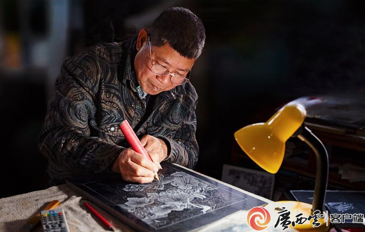 新闻眼人间烟火气,最抚凡人心。广西云-广西日报特别推出“广西烟火”专栏,记录烟火人生里平凡者的故事。此前,专栏已陆续推出“八桂夜市”“八桂圩日”“年味一道菜”3个系列,今日开始推出第四期“发现民间绝活”系列报道,带您走近广西新生代手艺人,看他们以新技法焕活老技艺,用创意点燃市场,让民间绝活破圈生长、融入日常、激活产业;邀您在烟火升腾处,共鉴技艺新生,触摸匠心温度,感受文化脉动。 视频摄制:陈智超 12月28日,贺州平桂区望高镇,风声萧瑟,阳光慵懒。一栋居民楼里传来密实的“嗒、嗒”声,如秒针踱步,沉静而坚定。 三楼工作室里,68岁的左世运俯身案前,左手按住一方墨玉石板,右手攥钢凿,手腕稳如磐石,凭掌指细微发力,凿尖起落,石粉轻扬。星点白芒中,山水轮廓、鸟羽眉眼渐次浮现……这,便是“石上绣花”的贺州影雕。