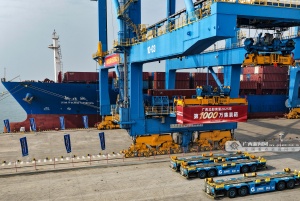 12月30日上午,“广西北部湾港集装箱吞吐量突破1000万标箱仪式”在北部湾航运中心顺利举行,标志着广西北部湾港成功迈入千万标箱大港行列,也意味着广西如期完成《西部陆海新通道总体规划》确定的主要目标任务。记者 周军 摄(广西云-广西日报)