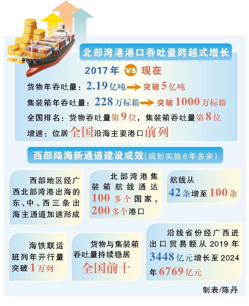 北部湾港港口吞吐量跨越式增长。制表 陈丹 数智赋能,激活跨越“智慧引擎” 远程操控室内,广西钦州保税港区宏港码头有限公司操作部轨道吊远控员谭婷元轻握控制手柄,目光紧盯屏幕:“过去老师傅需攀爬岸桥,在狭小的驾驶室里凭肉眼与经验进行人机合一操作;如今我在远控中心,通过高清摄像头与传感数据就能远控作业。” 站在站台远眺,桥吊如钢铁巨人般舒展臂膀,将一个个集装箱精准吊运;无人驾驶智能导引运输车往来穿梭,将集装箱如积木般有序码放,全程无需人工干预。如今的自动化码头,与2017年靠人工登记、机械粗放作业的场景判若两境,昔日车船如织却需人工协调的场景,已化为屏幕上流畅跃动的数据河流。 千万标箱的高效流转,离不开智慧大脑的精准指挥。走进北部湾港,科技感扑面而来:全国领先的海铁联运数字化散货堆场,巨型机械臂精准操作,行云流水;电子数据交换平台(EDI)、数字化运营管控平台(OCC)与“北港网”一体化平台三脑联动,让港口生产经营全程可视、物流数据融合协同。 同时,北部湾港通过建成示范项目和多个平台,实现生产经营可视、数据协同;打造“海铁联动集疏运平台”,实现全国首创海铁数据实时对接,数据时延从30分钟骤降至1分钟以内。实施海铁联运一体化“小切口”改革,综合作业效率提升30%,经验做法在全国港口复制推广,驱动港口全面数字化转型。 向海图强,织就全球“共赢网络” “过去长安汽车出口,要从重庆运到上海再海运,耗时久、成本高。”重庆长安汽车股份有限公司物流中心负责人介绍,如今公司每周都有整车及零部件通过西部陆海新通道海铁联运班列从钦州港出海,时间节省了7—10天。 这般便捷高效的物流格局,源于广西与重庆深化合作共建西部陆海新通道的持续发力,形成了渝桂“陆海通”通关便利化改革、海事一体化监管、“铁路笼车+海运滚装船”一站式服务等系列标志性成果。如今,北部湾港约40%海铁联运班列到发集装箱均来自重庆,渝桂协同出海效应凸显。 这样的高效联动,在2017年尚难以想象——彼时,西部陆海新通道海铁联运班列从钦州港首发,全年仅运输集装箱货物3382标箱。而今,北部湾港海铁联运班列辐射范围覆盖18省(区、市)75市163个站点,开通一口价线路190条,运输品类拓展至1300余种,还与中欧、中亚班列实现常态化对接,全年班列发送量突破50万标箱。 随着“13+2”省际共建格局愈发稳固,西部陆海新通道为企业提供更加便捷的物流支撑,助力更多产品走向全球,实现“通道带物流、物流带经贸、经贸带产业”的良性循环发展。截至今年11月底,经北部湾港出口的新能源汽车、锂电池、光伏产品等“新三样”箱量,分别同比增长7%、258%、1401%。 志合者,不以山海为远。9年奋战,西部陆海新通道已织就一张覆盖全球的“共赢网”:北部湾港近洋航线贯通东南亚、东北亚主要港口,远洋航线直达非洲、北美、南美、印巴地区,内贸航线紧密连接中国沿海经济脉搏。 从2017年锚定目标、奋楫启航,到2025年圆梦千万、航线破百,北部湾港的9年,是践行“四个一流”嘱托的9年,是融入共建“一带一路”、建设西部陆海新通道的9年。站在新的历史坐标上,北部湾港这艘巨轮,正向着建设世界一流港口的目标,向着更深、更蓝、更广阔的未来,全速前进。