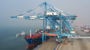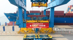 12月30日,在海事部门的全程护航保障下,靠泊在钦州保税港自动化集装箱码头的“新防城”轮顺利接装今年北部湾港第1000万个标准集装箱,标志着北部湾港2025年度集装箱吞吐量突破千万标箱大关。图为北部湾港2025年度集装箱吞吐量突破千万标箱大关。蒋瑞卿 摄(广西云-广西日报)