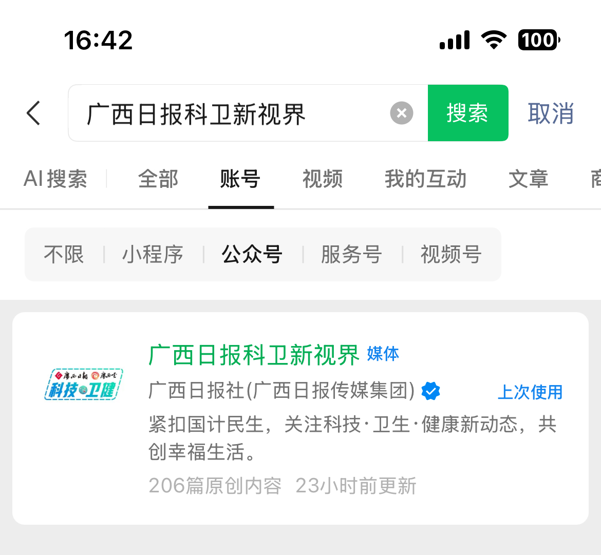 领取服务操作流程:第一步,微信搜索并关注“广西日报科卫新视界”微信公众号。