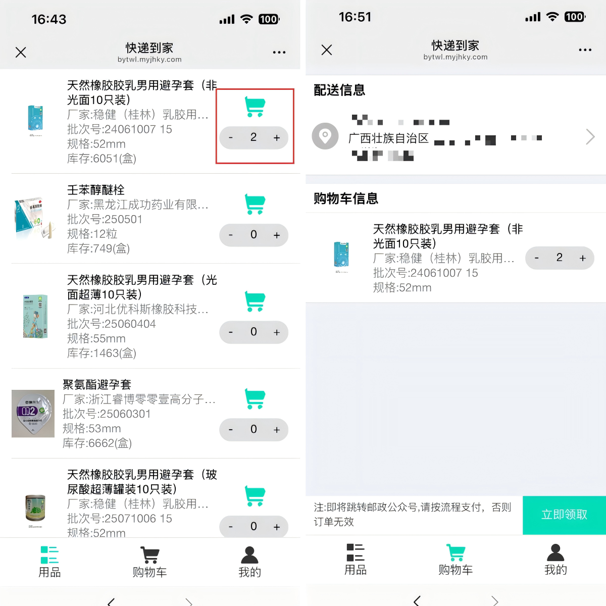 领取服务操作流程:第三步,选择所需避孕药具种类、填写收货地址、支付6元快递费用。 据了解,通过“广西免费避孕药具公共服务”微信公众号也可以申领避孕药具。线上领取的避孕药具均为国家免费提供,线上领取收件地址仅限广西壮族自治区内,领用者需承担送货上门而产生的6元快递费用,国家免费避孕药具每人每次限领2盒。用户在线提交免费领取申请后,客服人员将会在2个工作日内审核,审核通过按下单先后顺序交由邮政快递寄出。 需要领取避孕药具的市民,请关注上述微信公众号,体验“线上下单、配送到家”的便捷服务。 |