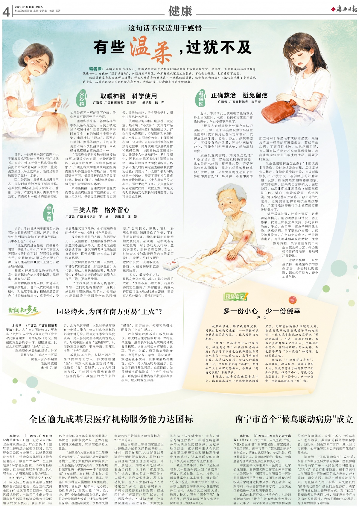 低温烫伤后,要及时脱离热源。图片由AI生成 发生低温烫伤时,如何紧急处理?叶敏才给介绍,首先要及时脱离热源,比如关闭电热毯、移开热水袋,若受伤部位有衣物覆盖,需小心轻柔地移除或剪开衣物;接下来用室温的流动自来水持续冲洗伤处15—20分钟,不便冲洗的部位可用干净湿毛巾或纱布湿敷;最后用清洁干燥的纱布覆盖创面,若已产生水疱,不要自行挑破。如果疼痛明显,可口服布洛芬或对乙酰氨基酚缓解。若出现水疱较大且已破溃的情况,需要及时就医。 发生低温烫伤后怎么办?“Ⅰ度或浅Ⅱ度烫伤,经过上述紧急处理,后续坚持伤口换药,保持皮肤清洁干燥,可以渐渐恢复。”叶敏才说,若创面出现红肿加剧、发热、疼痛突然加剧等感染迹象,需立即就医。如果烫伤面积较大、程度较深,如深Ⅱ度或Ⅲ度烫伤(创面基底呈白色、蜡白、焦黄或炭黑,感觉迟钝,疼痛感轻甚至无痛感),除上述的处理外,还需要清创和使用抗生素抗感染,严重可能还需进行手术植皮或皮瓣转移等治疗。 对于后续护理,叶敏才建议,患者要定期换药,密切观察伤口情况,防止感染。饮食上加强营养支持,多吃新鲜果蔬、牛奶、鱼肉等,避免辛辣刺激食物,远离烟酒。为了避免疤痕增生、感染等并发症,在伤口完全愈合、无破溃渗出后,可使用硅酮凝胶或贴敷,注意做好防晒,关节部位的伤口可适当使用弹力套、弹力绷带持续轻微加压,并加强功能锻炼。 叶敏才提醒,一旦发生烫伤,要遵循科学的急救方法,必要时及时就医,切勿轻信偏方,避免加重伤情。 新闻知多少|同是烤火,为何在南方更易“上火”? 广西云-广西日报记者 罗婧 北方人在南方围炉烤火,更容易“上火”?从北方来到南方的王女士对此感受颇深:同样是冬日烤火,她在南方总会嗓子干痒、眼睛发红,比在北方更容易出现“上火”症状。