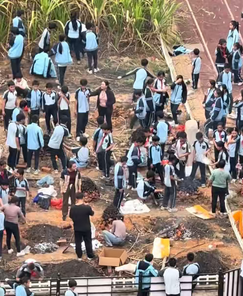 视频画面显示,学生在操场沙土区垒起多个土窑,现场炊烟缭绕,孩子们动手添柴生火、积极参与,忙得不亦乐乎。一旁孩子们种植的甘蔗已长至一人多高,与热闹的“窑鸡”场景相映成趣。网友看后纷纷调侃:“广西‘科目四’真是从娃娃抓起了!”据了解,进行这项特色实践的学校是南宁市良庆区那黄小学。