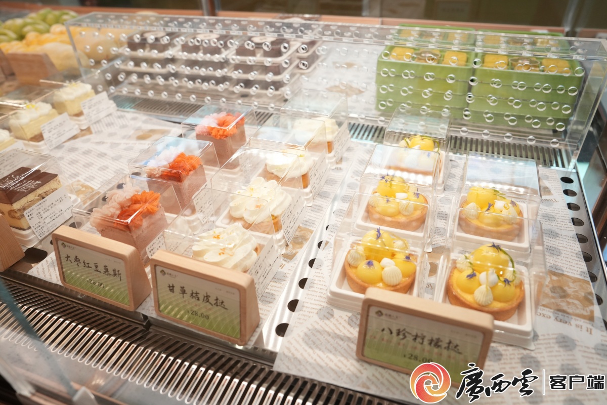 精致美味的药膳糕点。广西云-广西日报记者 古秀芳 摄 开业当天虽飘着毛毛细雨,仍挡不住市民尝鲜的热情。走进店内,一股淡淡的草药香扑面而来。取餐区前,人们有序取餐,养生炖汤热气腾腾;一旁的养生面点区和药膳茶饮专区,也有不少顾客驻足挑选。“店内茶饮只有常温和热饮,没有冰。”药膳馆销售负责人表示。记者品尝一杯茶饮发现,茶饮草药香明显而口感温润顺和。此外,店内药膳糕点品种丰富,涵盖蛋糕、面包、馒头、曲奇等,每个品种都明确标明了所含药材,方便市民选购。