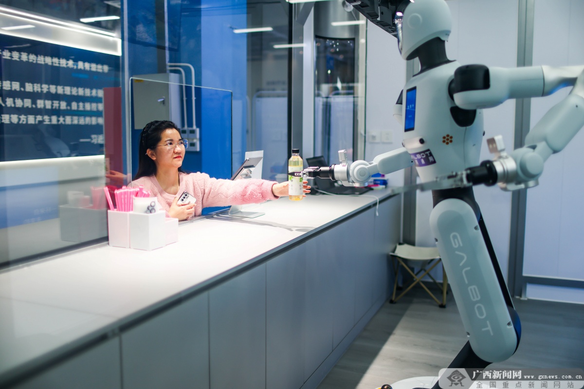 在广西人工智能学院,机器人正在给点单的老师送上商品。广西云-广西日报记者 游拥军/摄 新环境 教室消失,工位成为新课堂 踏入位于南宁五象新区的广西人工智能学院,广西云-广西日报记者首先感受到的是一种不同于传统高校的空间感。 一楼大厅没有常见的校训墙或名人雕塑,取而代之的是一系列动态展示屏,实时呈现着智慧口岸无人车调度系统、甘蔗病虫害识别模型、跨境贸易多语言翻译平台等AI应用场景的运行状态。屏幕上跳动的数据和不断更新的可视化图表,让这里更像一家科技公司的产品展示中心而非学校大堂。 再往里走,学院内部空间设计彻底打破了“教室”的概念。传统的固定桌椅教室几乎不存在,取而代之的是开放式办公区、项目讨论室、实验室和多功能研讨空间。每个学生都有自己固定的工位,配备双显示器、高性能工作站和稳定的网络连接——这几乎是许多科技公司标准配置。 “这个大平层让我感觉就像以前待过的大厂。”一位曾在互联网企业工作的广西人工智能学院导师坦言。这里开放式的布局,促进了不同团队之间的交流:做农业AI的学生可能与研究口岸智能化的同学相邻而坐;来自桂林电子科技大学的研究生旁边,可能是广西大学或广西师范大学的学生。 实验室区域,更是体现了学院的特色。机器人实验室里,不同型号的机械臂正在进行协同操作训练;具身智能实验区,仿生机器人学习着避障和物体抓取;在数据标注工作区,学生们正对无人机拍摄的广西特色作物影像进行精细标注,这些标注数据将被用于训练更精准的识别模型。