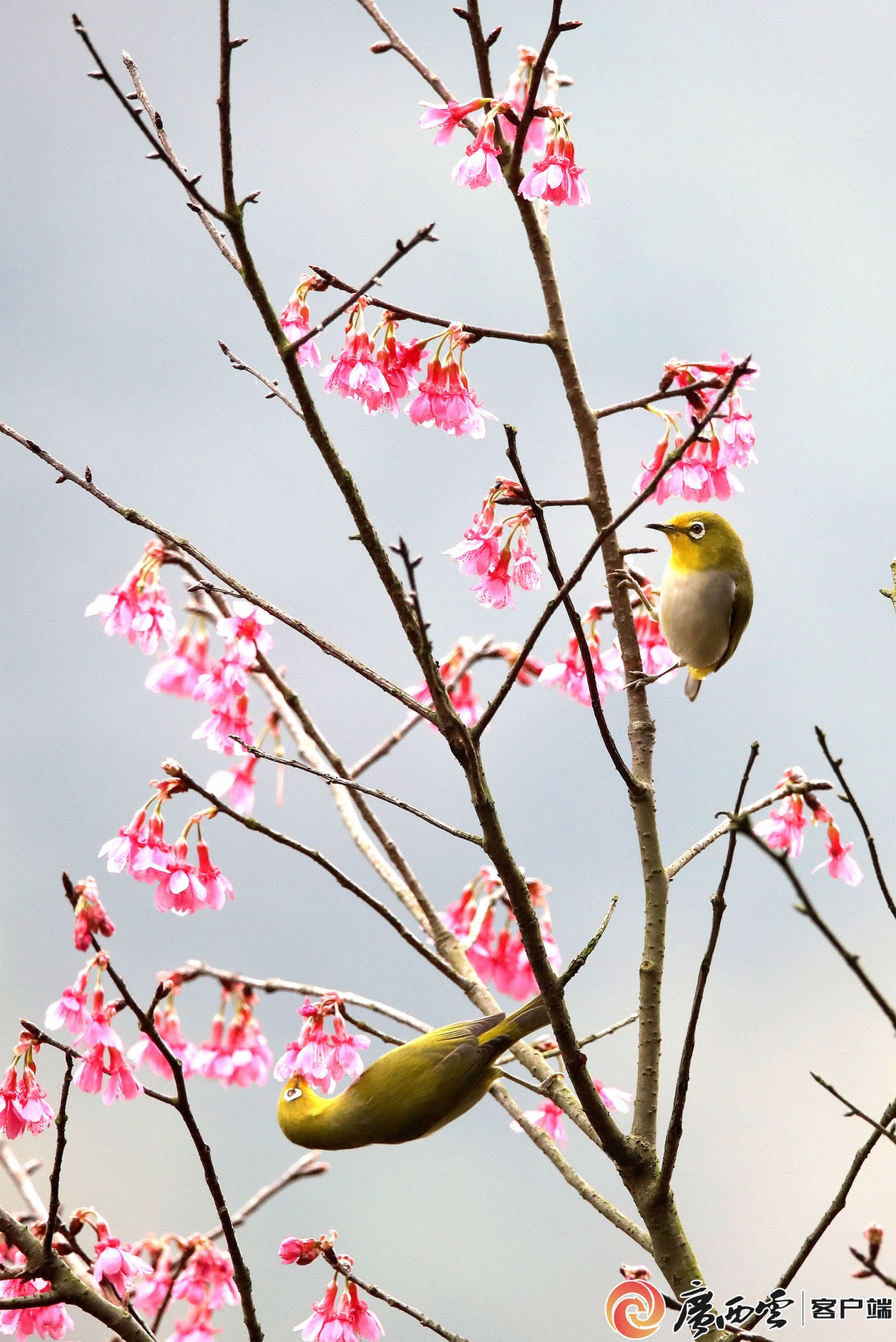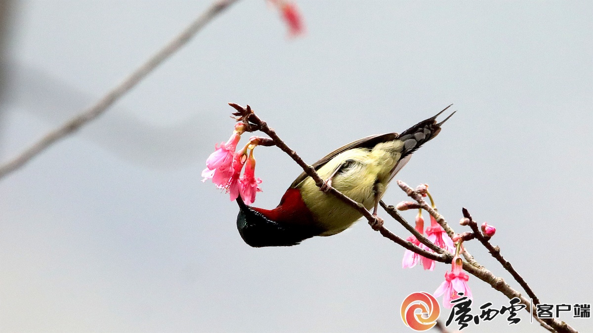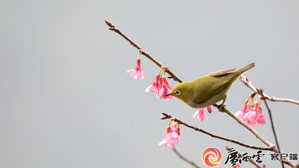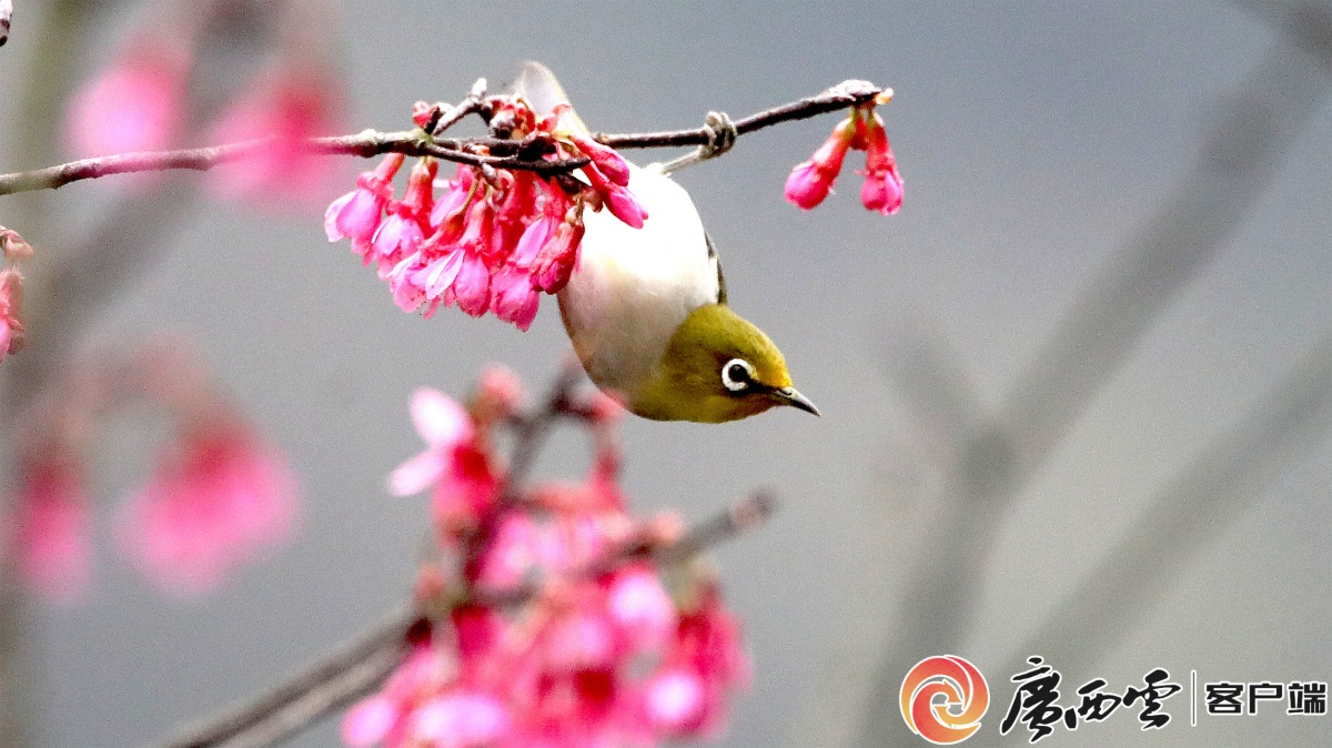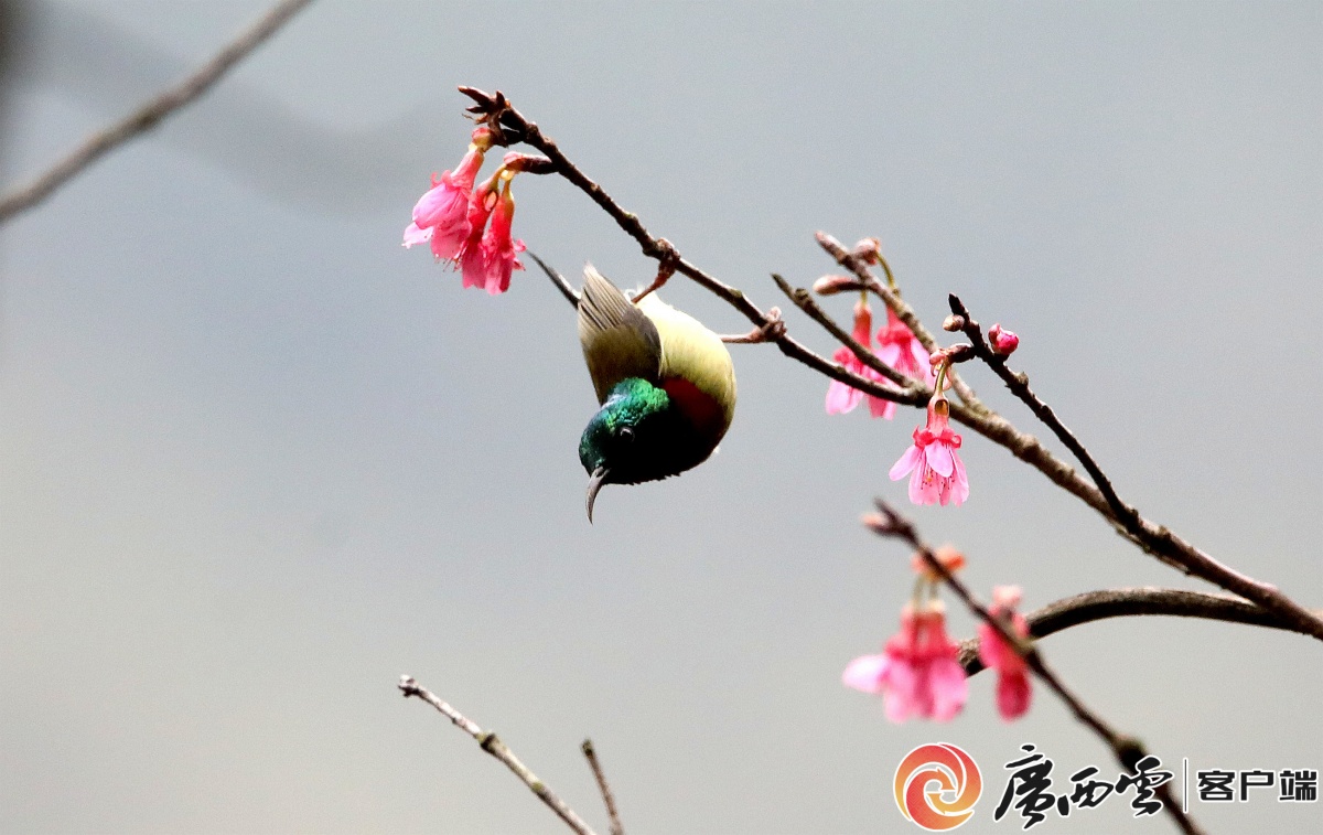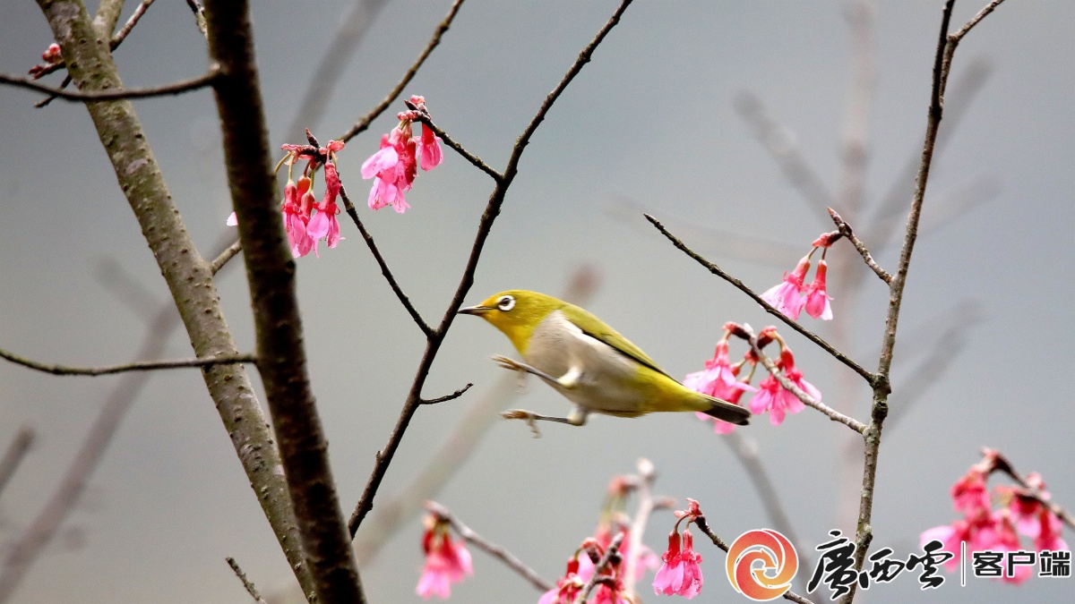 2月21日,鸟儿在融安县东起乡崖脚村铜板屯的野樱花树上觅食。