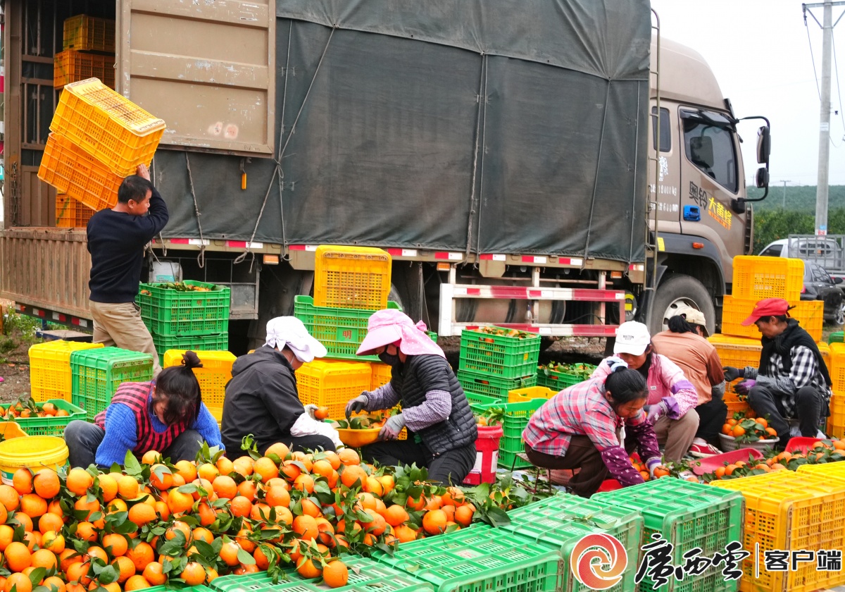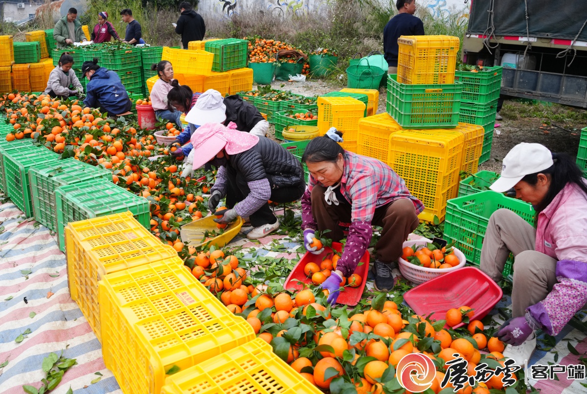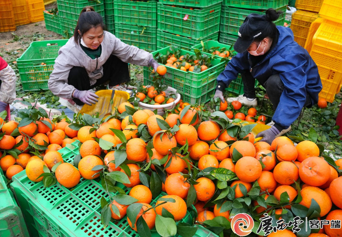 2月21日,在南宁市武鸣区罗波镇一个沃柑果园边,果农忙着分拣刚采摘下来的沃柑,装箱运往全国各地市场。