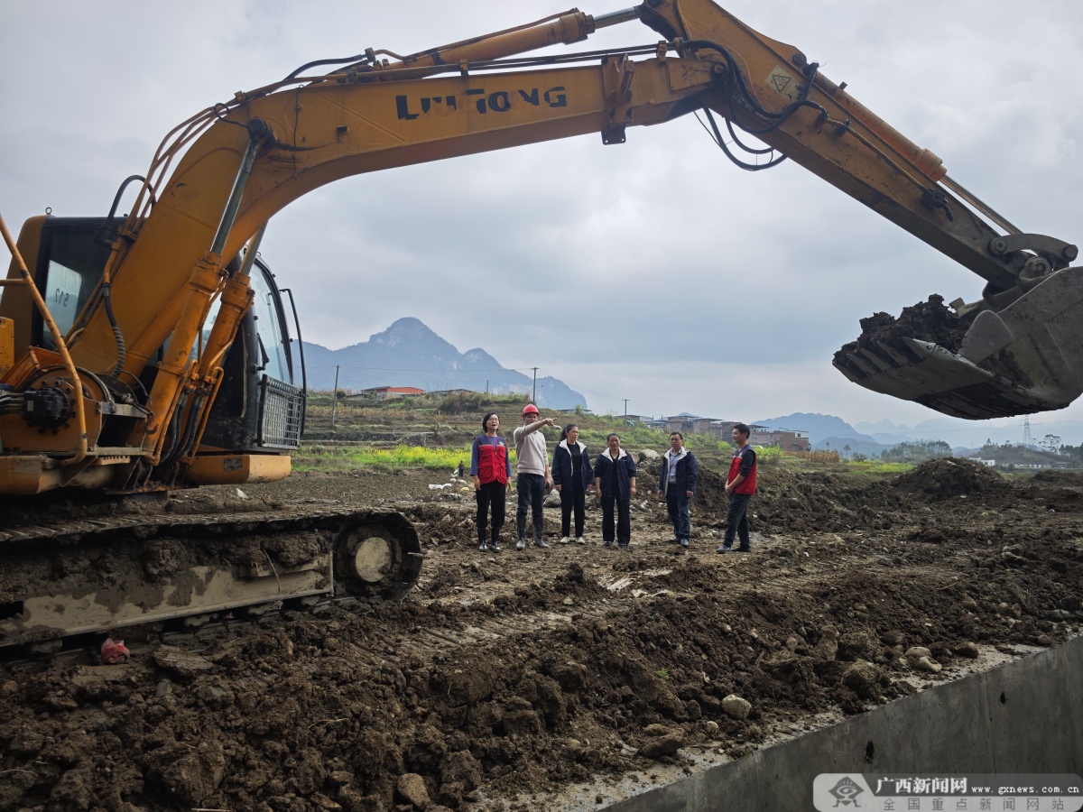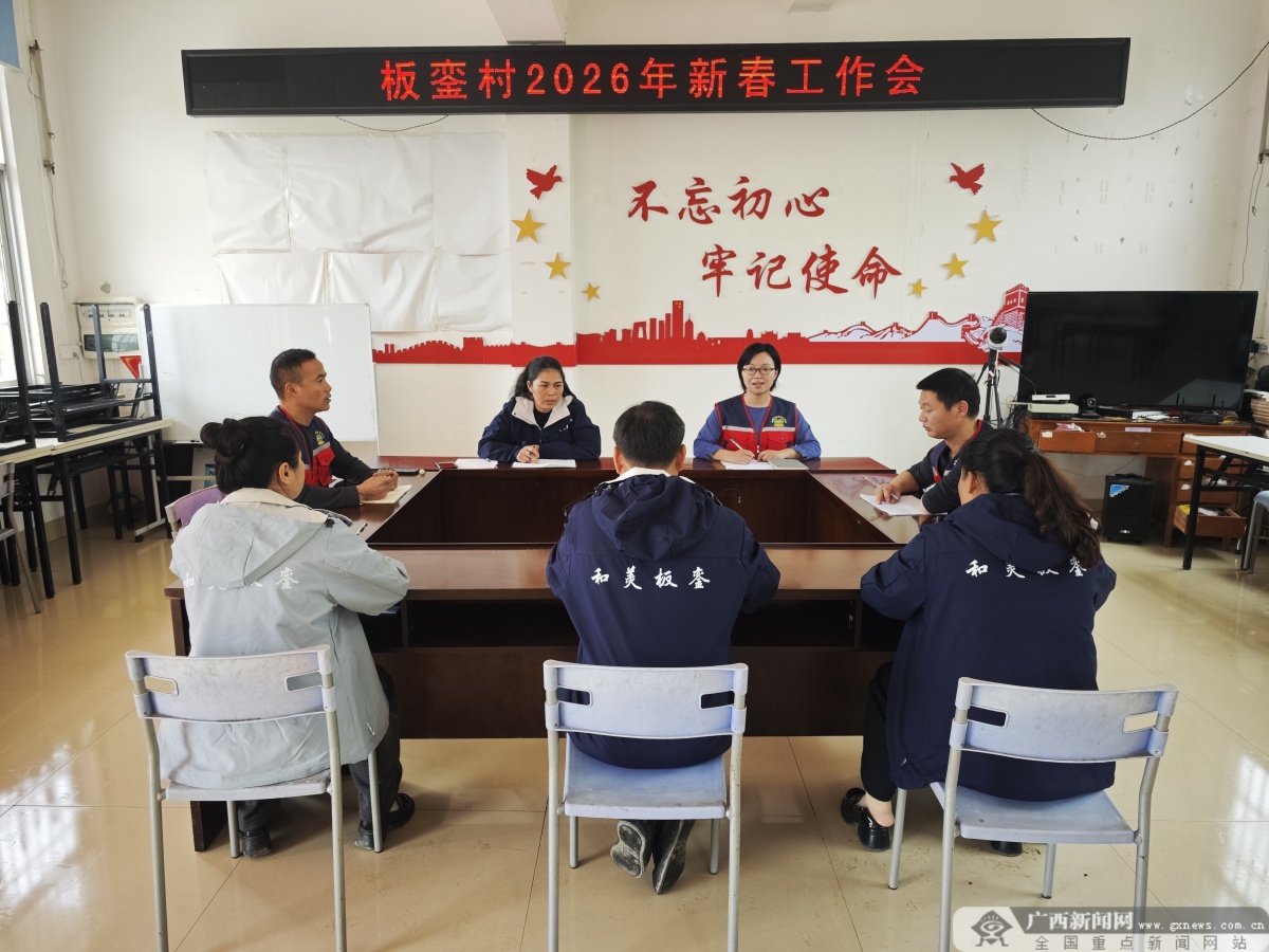 板銮村2026年新春工作会布置会现场。通讯员 袁弟 摄 自治区妇联派驻河池市金城江区板銮村第一书记蒋萍,在笔记本上划拉着近期要办的事:春耕备耕、山洪沟治理工程、妇女节、植树节……2025年5月8日,当这位人类学博士第一次踏上板銮村的土地时,她面对的不仅是喀斯特地貌的层峦叠嶂,更是一个期待发展的多民族聚居村落。从机关办公室到田间地头,从一名妇联的机关干部变成村民口中的“蒋书记”,蒋萍将全部心力倾注在了这片热土上。 她合上本子,“走,去工地看看。” 在花笼河山洪沟治理工程的工地,挖掘机正把淤泥一斗一斗挖上来。她盯着工地看了一会儿:“这一段清出不少淤泥,比年前看着宽了。”