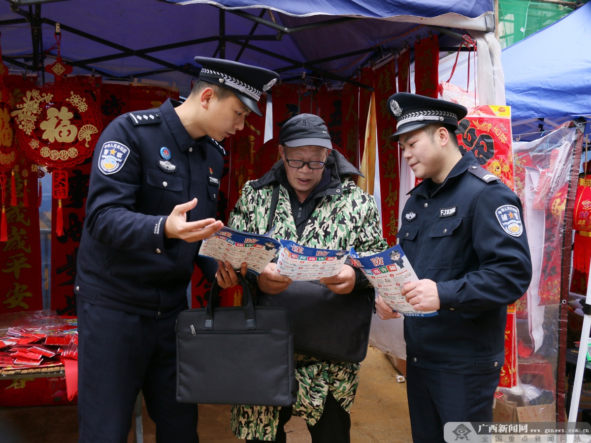 吞盘边境派出所民警、辅警开展反诈宣传工作。 党员民警高胜群挤进人群。他一手拿绣球,一手举反诈宣传单,普通话、壮语轮番上阵:“阿叔阿姐,陌生链接莫乱点,自称‘公检法’人员要求你转账,别轻信!” 话落,绣球划出弧线,精准抛向人群。 “高警官,再抛一个!”一名中年汉子接住绣球,扯着嗓子喊,“接住你的绣球,出门务工肯定平平安安!” “接住绣球,更要记住反诈知识,守好‘钱袋子’,全年顺顺利利!”高胜群笑着回应。欢声笑语中,普法宣传手册已递到群众手里。 午后,雾气渐散。简单休整后,高胜群和同事组成巡逻队,沿着边境线巡逻。 吞盘乡边境线山高林密,小道纵横。即便是春节假期,在这条用脚步丈量平安的路上,边境派出所民警的巡逻也从未停歇。 阳光穿透薄雾,洒在蜿蜒崎岖的巡逻道上。警车开不进去的地方,就靠双脚。 “这段防护网被雨水冲松了,得加固。”巡至一处界碑附近,高胜群蹲下身,仔细检查物理阻拦设施。辅警梁国安默契递上铁丝和钳子,几人合力,将松动处重新绑紧。