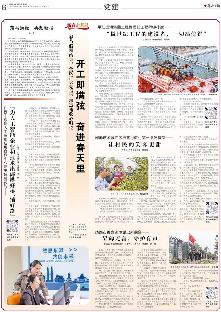 原标题: 春节假期结束,全区广大党员干部迅速收心归位—— 开工即满弦 奋进春天里 短评: 策马扬鞭 再赴新程 新元肇启,实干开年。 2月24日,春节假期圆满画上句号。开年复工首日,八桂大地已是热气腾腾的奋斗图景。从创新前沿到工地一线,从边关哨所到广袤乡村,广大党员干部以饱满状态收心归位、迅速入岗,奏响新春开局的奋进序曲。 人勤春来早,奋斗正当时。过去一年,广西经济增长取得多年未有的好成绩,高质量发展其时已至、其势渐成、其兴可待。今年是“十五五”开局之年,我们要牢牢把握高质量发展这个首要任务和构建新发展格局这个战略任务,勠力进取、奋勇争先,不断巩固拓展经济稳中向好势头。 起步决定走势,首季关乎全年。眼下,一季度时间已经过半,发展时不我待、只争朝夕。我们要进一步增强高质量开局的责任感紧迫感,把稳增长放在更加突出的位置,围绕全年总体部署和一季度重点工作,能快则快、靠前发力、争取主动,全力以赴“跑好第一棒”,为完成全年目标任务打下坚实基础。 节后返岗,贵在收心定神,重在落地见效。我们要坚持实干为要、创新为魂,用业绩说话、让人民评价,树立和践行正确政绩观,以踏石留印、抓铁有痕的劲头,一个阶段一个阶段扎实推进各项部署落地落实,让实干进一步成为广西干部身上最鲜明的特征,努力创造经得起实践、人民、历史检验的实绩。 丙午马年当有骏马的精气神。让我们坚定必胜信心,保持昂扬斗志,策马扬鞭、勇往直前,以“一马当先”的锐气和“马不停蹄”的干劲,奋力谱写中国式现代化广西篇章。 故事1: 广西—东盟人工智能应用合作中心副主任莫灵聪—— “为人工智能企业和技术出海搭好桥、铺好路” 2月24日,春节假期后上班首日,中国—东盟国家人工智能应用合作中心的办公区内,干事创业的热潮在各个岗位间涌动。该中心的干部职工们按时到岗,迅速从“休假状态”切换到“工作状态”。 中国—东盟国家人工智能应用合作中心的干部职工们按时到岗,迅速从“休假状态”切换到“工作状态”。广西云-广西日报记者凌鹏 摄制 上午9时许,简短的工作布置会后,广西—东盟人工智能应用合作中心副主任莫灵聪与同事们一道,对照中心筹划的各项具体工作事项,细化推进方案、明确时间节点,为后续开展合作服务对接、推进项目落地做足准备。 “这个区域做互动是最好的,科普类的可放到二楼展示。” “这个板块展示标杆企业的人工智能发展情况能更直观展现产业实力。” “屏幕的动态展示部分加入语音功能是不是更合适?” …… 在人工智能展示厅,莫灵聪与同事们你一言我一语,围绕提升展厅展示效果、更好服务中国—东盟人工智能合作展开热烈讨论。 “中心展厅接待了很多海内外的来宾,今年会针对新的技术和应用做好展厅升级,将更多广西集成、优秀的、适合推动东盟出海的应用在展厅展现。”莫灵聪告诉记者。 开工第一天,同事们昂扬奋进的精气神,让莫灵聪既兴奋又充满紧迫感。