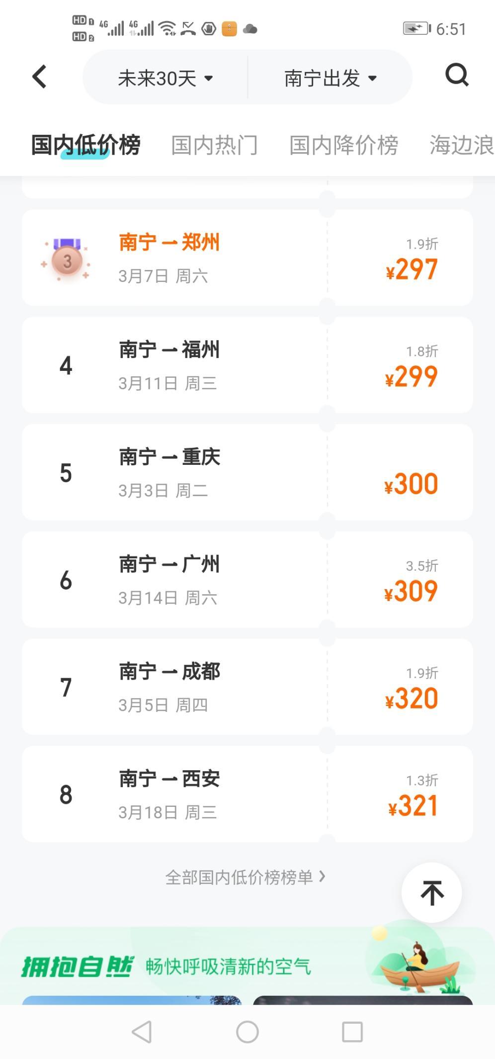 有人向外奔赴,也有人慕名而来。来自山东的黎女士被姐妹分享的南宁过年见闻打动,计划元宵期间专程来邕打卡。“听说南宁已花红柳绿,能在青山、绿树、花海中畅游,体验不一样的南国年味,想想就很惬意。”黎女士笑着说道。 年味不散,热度不减。春节叠加元宵的消费热潮,让南宁文旅市场后劲十足。南宁将新春氛围持续至元宵节。如“壮美广西·灯耀南宁”2026年青秀山新春灯会火热进行中,超70组大型灯组将东区化为梦幻国度,第一阶段持续到3月8日。2026年南宁城隍庙会将迎客至3月3日,贺马年新春市集每日开放,琳琅满目的年货好物与地道特色美食,为市民游客打造逛吃好去处。 节后机票“跳水”邂逅南宁春日浪漫 节后机票价格“跳水”,更是为错峰出游添了一把火。2月26日,记者查询各大票务平台发现,国内航线机票价格回落,热门航班折扣力度加大,高性价比出行时段到来。 去哪儿旅行平台数据显示,国内航线机票均价自2月23日触顶后持续下行,将于3月13日降至阶段低点。从当前至3月底的节后淡季,热门航线平均票价普遍回落10%至50%,如有南宁—福州、西安—桂林等多条“高性价比” 航线。