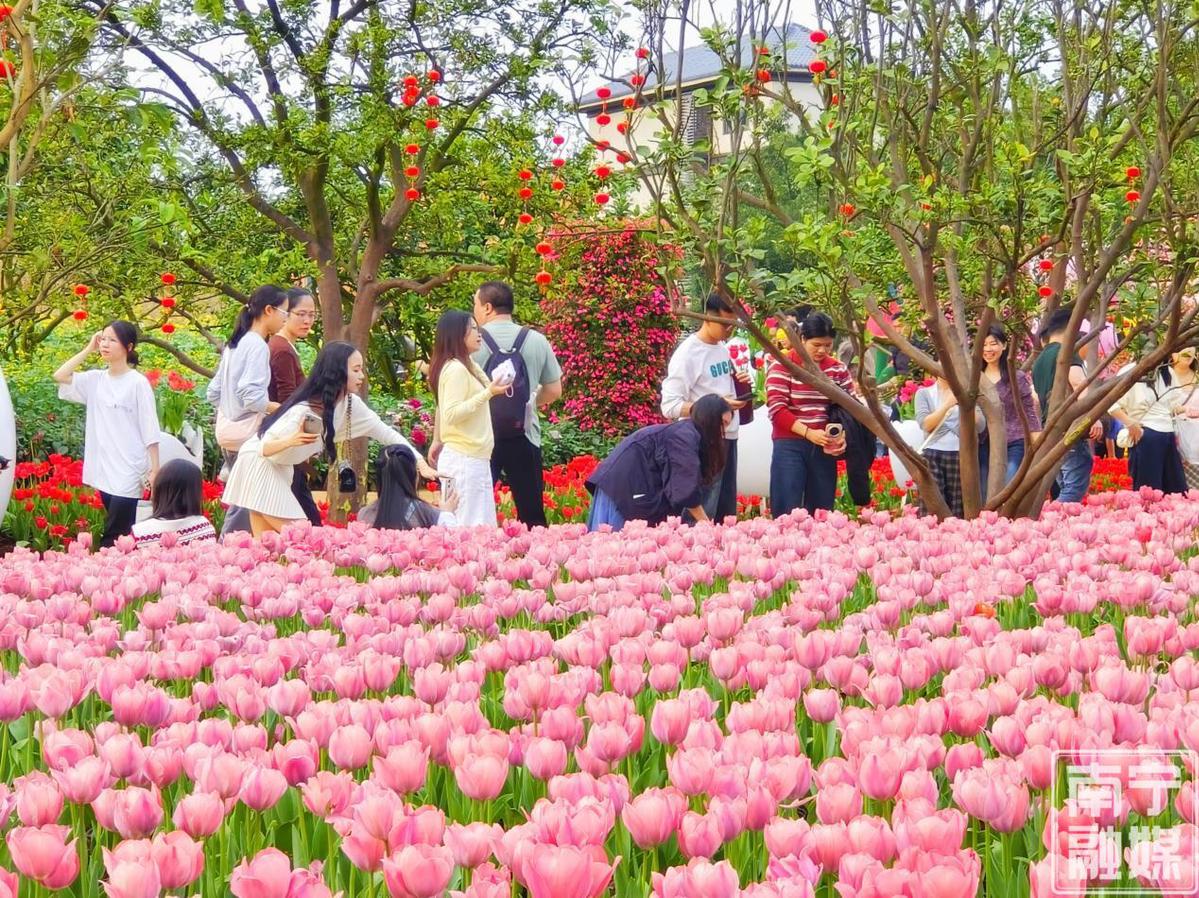 据了解,自2026青秀山“瓦来来”赏花季启动以来,景区游客接待量持续攀升。想要邂逅郁金香花海的市民游客,可得抓紧这赏花佳期。阳春三月将至,青秀山还将持续推出春日赏花季系列活动,黄花风铃木、樱花、桃花等花卉将次第绽放,届时整座山都将沉浸在姹紫嫣红的烂漫春光里。 不止青秀山,南湖公园的豆梨花素雅绽放,南宁市花卉公园的月季吐露芬芳,南宁市石门公园的樱花悄然盛开……当北方仍被冬雪笼罩,南宁早已满城春色,微风裹挟着花香拂面,空气里满是清甜的春意。 来自河北的游客杨女士赞叹:错峰出游正当时,南宁天气温暖宜人,在郁金香花海中漫步,年味与春意都很浓,坐在梨花树下休憩,格外惬意。