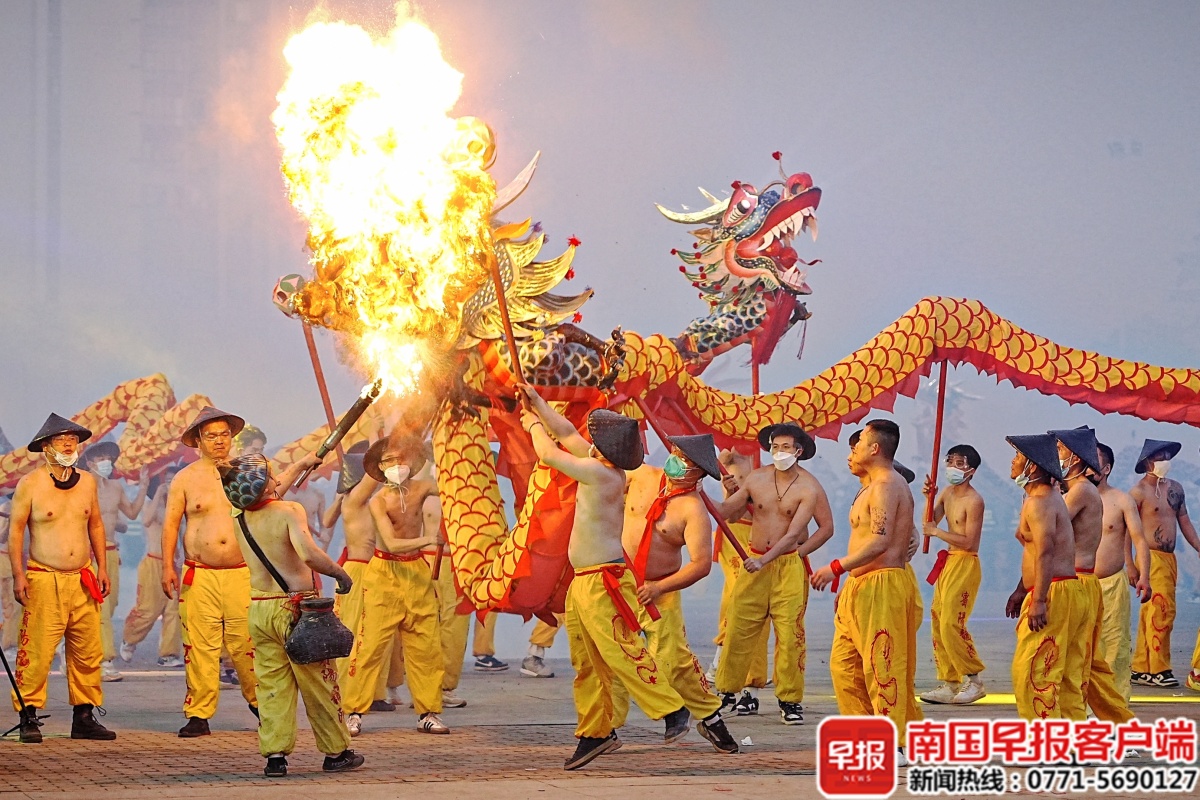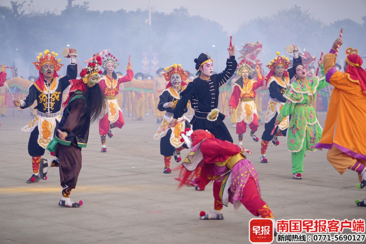宾阳县炮龙文化广场鞭炮齐鸣,震撼无比。 “开光点睛”仪式前,广东普宁头槌英歌队上演英歌舞表演,表演者们在阵阵鞭炮声中,伴随着激昂有力的鼓点腾跃起舞,将英歌舞粗犷豪迈的气势展现得淋漓尽致。