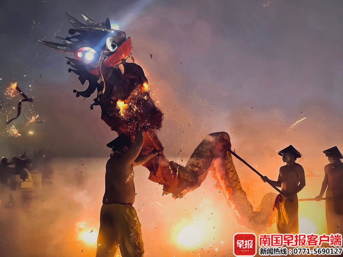 宾阳炮龙喷火表演。 在炮龙节系列活动中,一名扎着马尾辫的女孩在炮龙队伍中十分吸睛。她弓着腰,右手探入腰边的竹笼,抓起一把黑色粉末,右手自下而上奋力一扬,黑色的粉末腾空而起,只听得“呼”的一声闷响,打出一个个升腾的烟圈。 女孩名叫巫钰鸿,今年11岁,这已经是她第二次参加炮龙节。“今年技术比去年进步多了!”巫钰鸿一边比划一边对记者说,火药抓得更多,用力往上抛,一次能打出好几个烟圈,“这些都是爸爸教的,跟着他练得多了,技术就越来越好了”。 女孩口中的爸爸,是有着三十多年火药抛撒经验的老师傅巫革新。他站在一旁,看着女儿熟练地抛撒火药,眼中满是骄傲。“我做了三十多年火药手,现在轮到她上手了。”巫革新告诉记者,这两年,他发现舞龙队伍里年轻面孔变多了,越来越多人愿意来学舞龙、抛火药,将非遗项目传承下去。