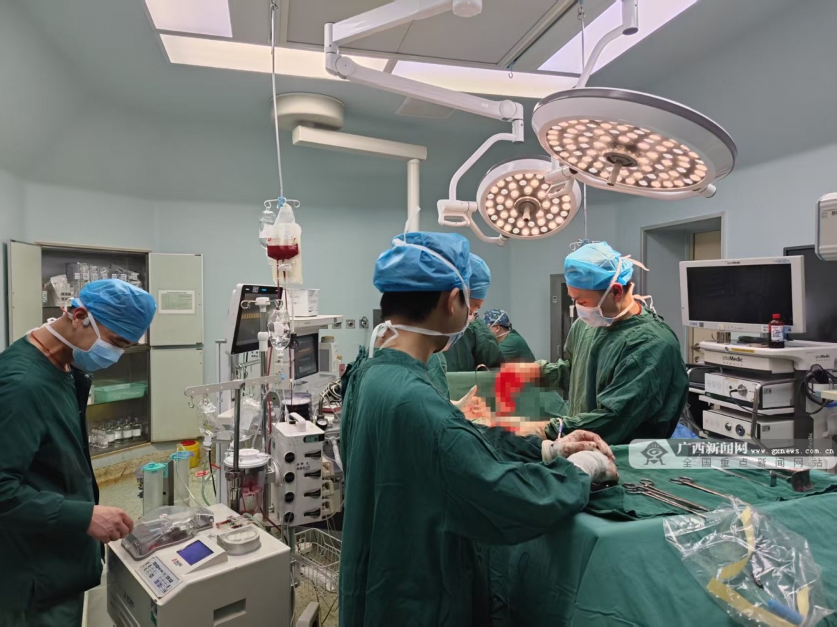 手术现场。自治区南溪山医院供图 时间回到2月16日,农历除夕,桂林市雁山区大埠乡59岁的莫先生骑摩托车时,为避让突然冲出的犬只不慎摔倒,当即腰腹部剧痛、面部出血。家属紧急将其送至附近的自治区南溪山医院雁山院区,接诊医护评估后,立即启动绿色通道,快速将其转运至崇信院区急诊科。 患者抵达急诊科时,已处于失血性休克状态。急诊科紧急启动多学科会诊,发现患者既往有右侧输尿管结石合并右肾积水,右侧肾实质已明显变薄,此次外伤直接导致右侧肾脏破裂大出血,生命体征极度不稳定,必须立即进行手术探查。 18时,就在万家灯火点亮、团圆饭即将开始之时,一场与死神的赛跑在手术室紧张展开。医生团队术中见患者腹膜后积血较多,右侧肾脏破裂严重,积血导致手术空间狭小、渗血多、视野差,操作难度极大。麻醉团队迅速启动自体血回输系统,同步开展输液、输血、升压等一系列抢救措施,其中自体血回输量达1150毫升,最大限度地为患者节约用血、保障循环稳定。手术团队在极度困难的条件下沉着应对、精准操作,果断为患者实施右侧肾切除术,彻底控制出血;同时,烧伤整形与创面修复外科团队为患者行面部裂伤修复缝合。