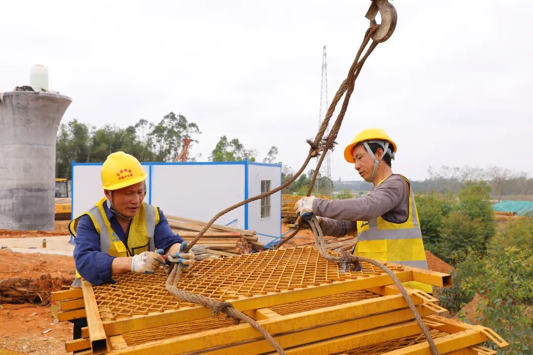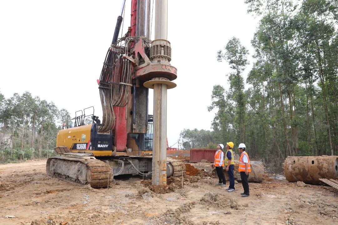 当天上午,在广西合浦县境内的合湛高铁南康东干渠特大桥,2台旋挖桩机正在进行桩基施工作业,施工人员有条不紊地进行现浇连续梁场地平整及支架安装等准备工作,技术人员按照安全穿透式管理要求,仔细检查每一项工作环节。