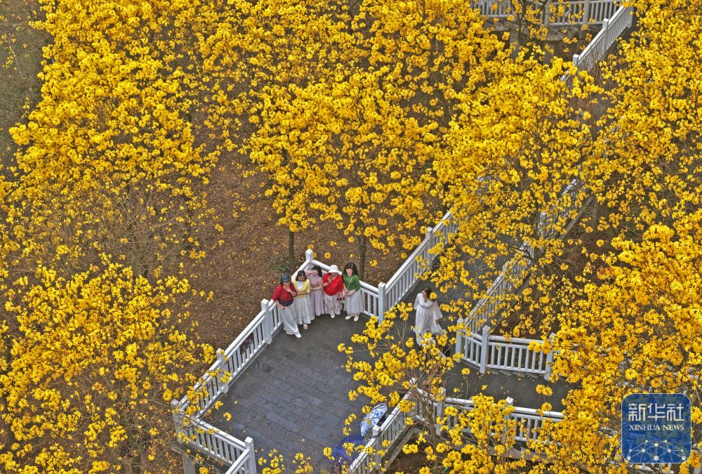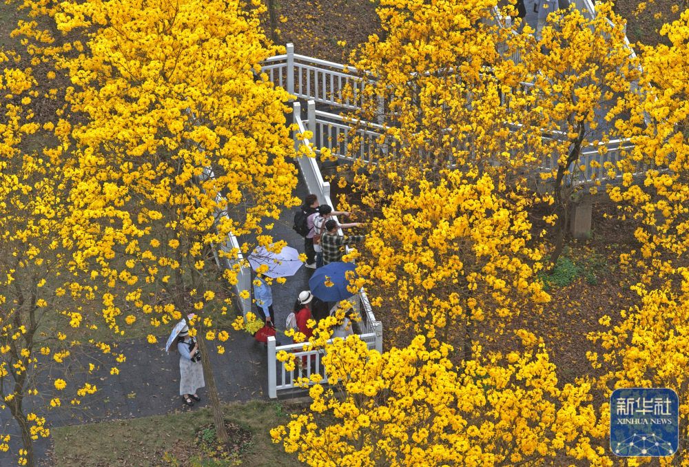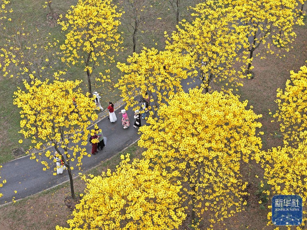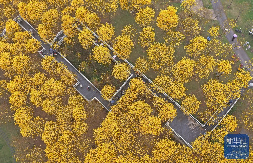 2月28日,游客在广西南宁市青秀山风景区观赏黄花风铃木(无人机照片)。新华社记者 周华 摄 |