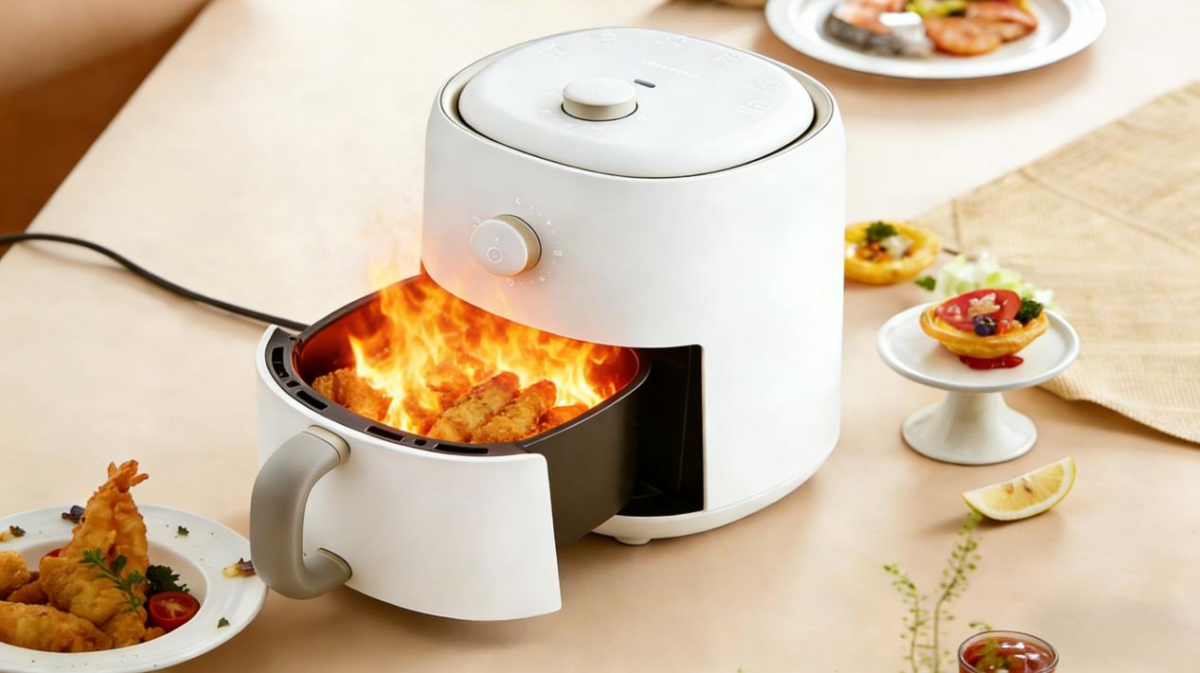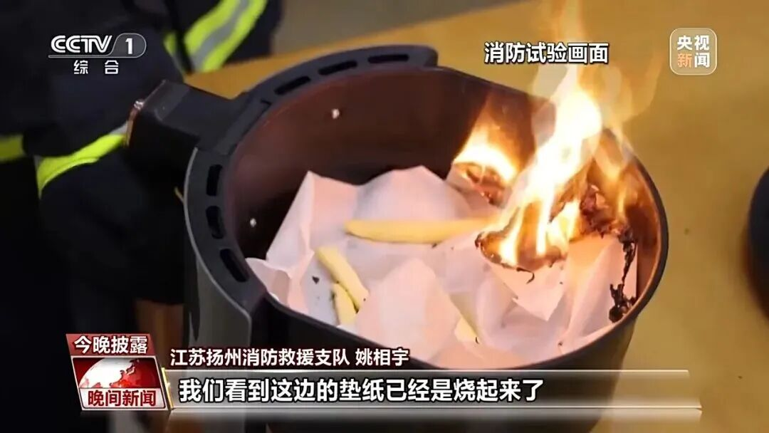 图为AI生成 什么是“空气炸锅”? 要说空气炸锅是用“空气”来炸食物,是有一些道理的。它利用的是快速空气技术,锅里有发热管和风扇,加热发热管之后,风扇会加速空气流动,空气通过加热管然后不断循环着通过食物的表面,不但空气炸锅里的整个空间都会热起来,而且还能带走食物中的水汽。 这种方式能通过快速气流把热量传递到食物的所有部位和侧面,再加上加热器的作用,产生了非常高的传热效率,并且产生和油炸类似的烹饪效果。咱们简单来说,就是用高温“空气”来“炸”食物。 空气炸锅的三大优点 1.比油炸热量低 传统油炸让食物本身增加脂肪含量,热量大大提高。比如:面包片吸油率可达80%,炸鸡蛋可达43%。而空气炸锅不仅不会增加油脂的热量,还可以把食物自身的脂肪逼出来。除了热量低,在营养保存等方面,空气炸锅也比传统油炸更胜一筹。根据实验数据,对比传统油炸鸡柳,空气炸锅制作的鸡柳维生素B1损失率仅为9.4%,而油炸损失率高达19%。 2.好清洁 空气炸锅是抽屉式设计,方便拿取清洁。内部大多使用了特氟龙材质,与不粘锅材质相同,也有的使用陶瓷、玻璃等材质,所以即便有油脂流出,也能很方便地清洁。如果用上硅油纸或者锡纸盘,就更省力了。 3.省时间 和烤箱相比,空气炸锅因为在小容量的密闭空间反复循环热风,所以烤东西比烤箱快很多。比如制作300g冷冻薯条,空气炸锅仅需16分钟,而烤箱需32分钟(含预热)。 空气炸锅使用不当,会变“火”锅? 空气炸锅工作时温度很高,重量较轻的垫纸如果没有被食材完整覆盖,很可能被热风卷起。一旦触碰到发热管,极易被点燃,从而导致机器短路或起火。 一起来看下面这组试验。 消防员将一张普通垫纸平铺在空气炸锅托盘内,并在垫纸上放置少量未铺满托盘的食物。机器运转一段时间后,消防员在出气口处闻到明显烧焦味,随即断电取出托盘,可见垫纸一侧已明显翘起,边缘出现大面积烧焦痕迹。 江苏扬州消防救援支队姚相宇表示,空气炸锅的托盘垫纸质地较轻,在风扇风力作用下可能被吹起,接触到上方的加热器。