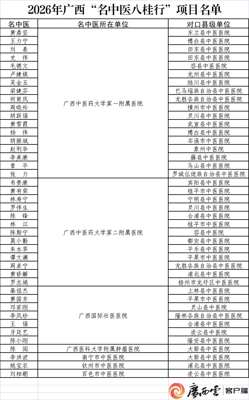 2026年广西“名中医八桂行”项目名单。自治区中医药局供图 义诊区内,一张张诊台前排起长龙。国家岐黄学者、桂派中医大师姚春,桂派中医代表性人物及学术传承人林寿宁等名中医专家刚落座,便被患者围得水泄不通。