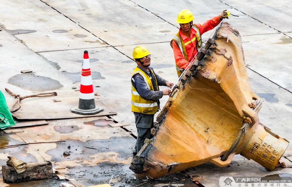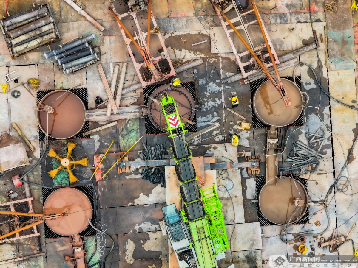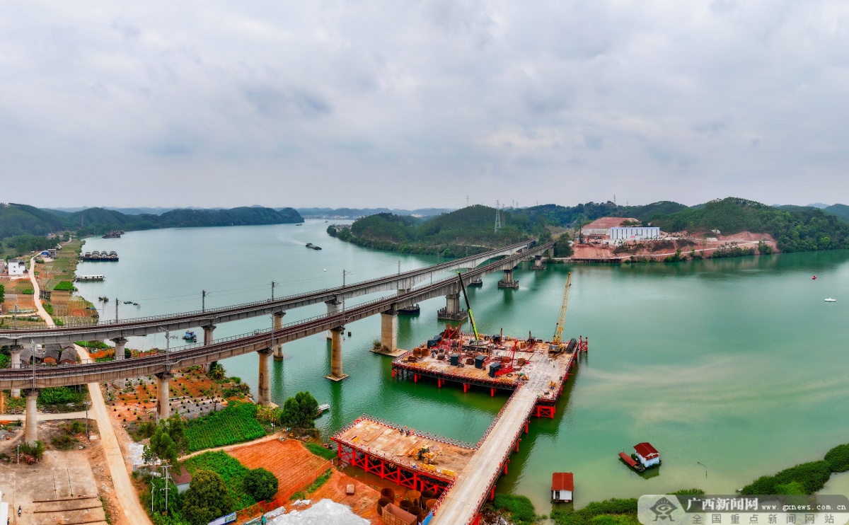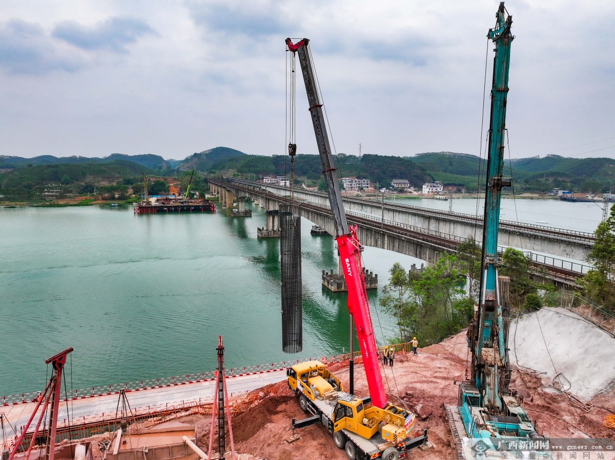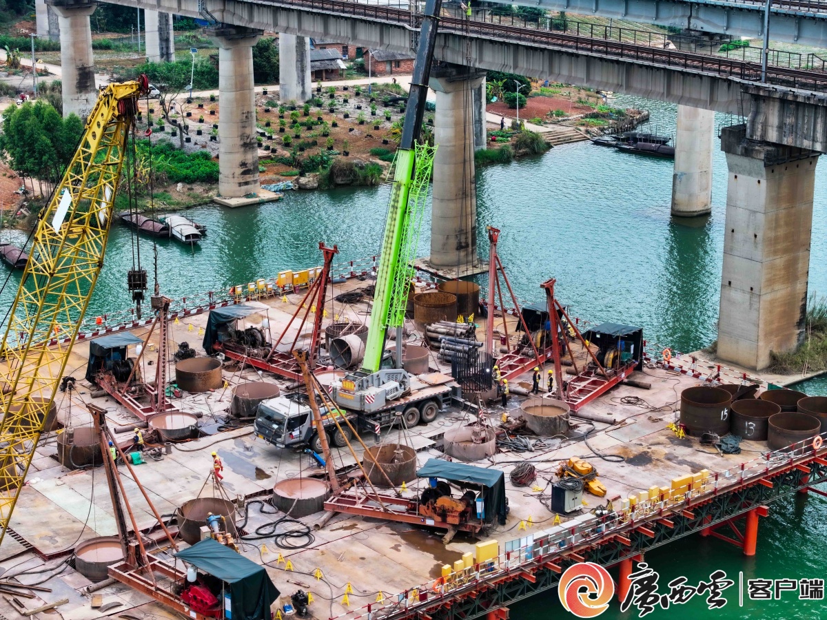 3月23日,在黎钦铁路飞龙郁江特大桥主桥改造现场,工人们正加紧水上桩基施工。目前,该项目21号主墩的首根水上混凝土桩基顺利完成灌注,标志着大桥核心关键线路的施工取得实质性进展。该桥建成后将打通5000吨级货船直航南宁港六景港区的通道。
