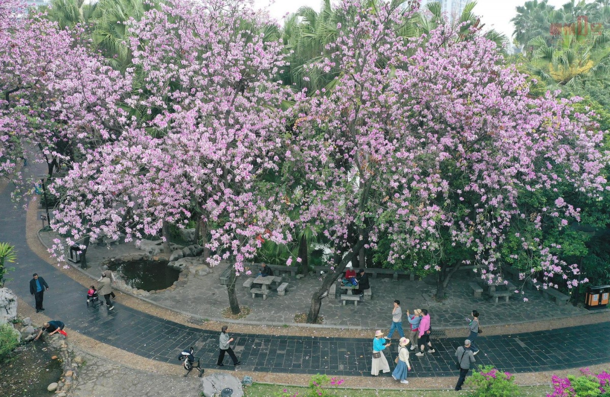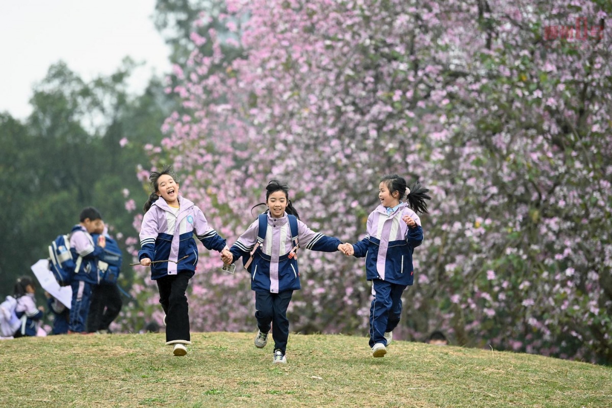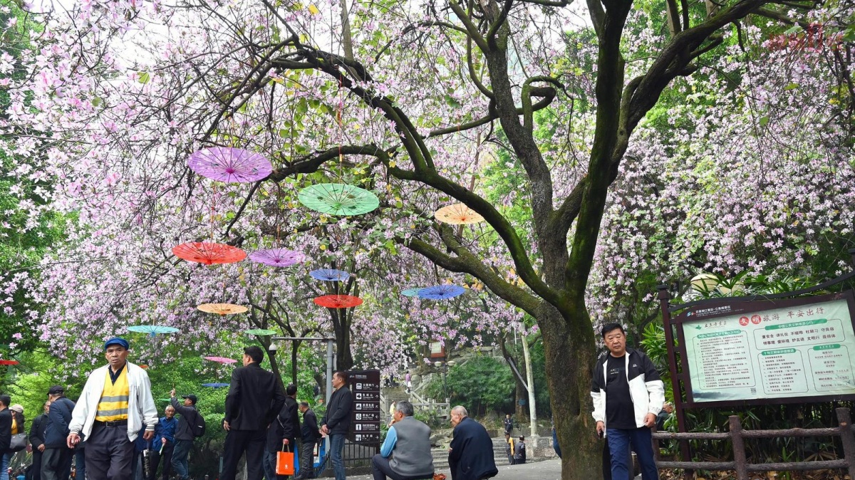 学生在龙潭公园洋紫荆花下奔跑。 在鱼峰公园北门,悠扬婉转的山歌伴着飘落的洋紫荆花瓣,增添了几分烟火气。这株62岁的洋紫荆,繁花满枝,粉紫色花朵层层叠叠,犹如一把撑开的伞盖。
