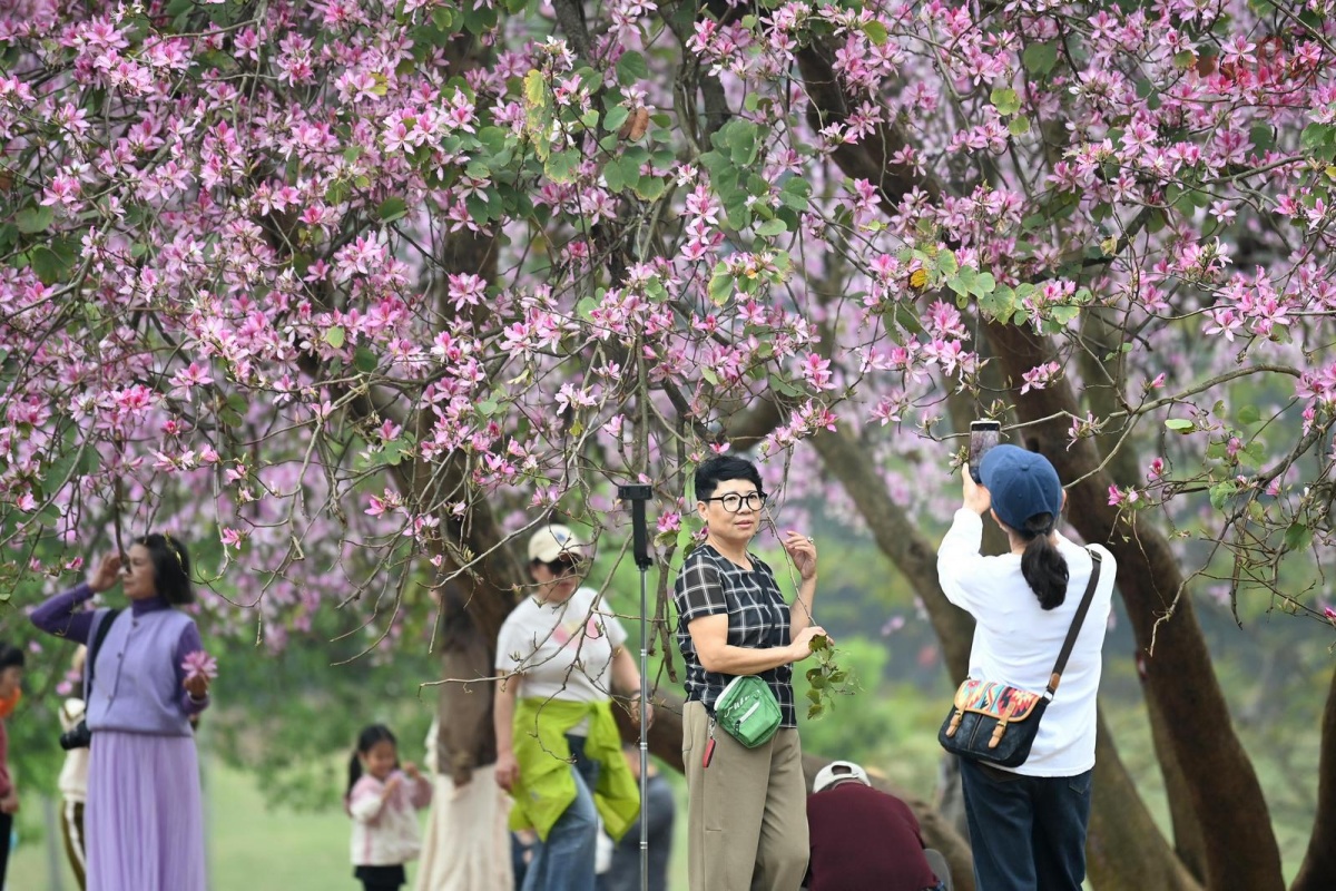 龙潭公园五株相拥而生的洋紫荆吸引市民游客打卡。