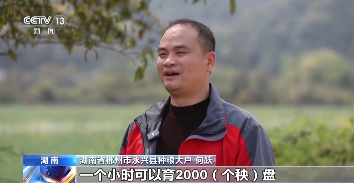 湖南省郴州市永兴县种粮大户 何跃:一个小时可以育2000个秧盘,一天全力运转的话,可以满足500亩到700亩的大田用秧需求。
